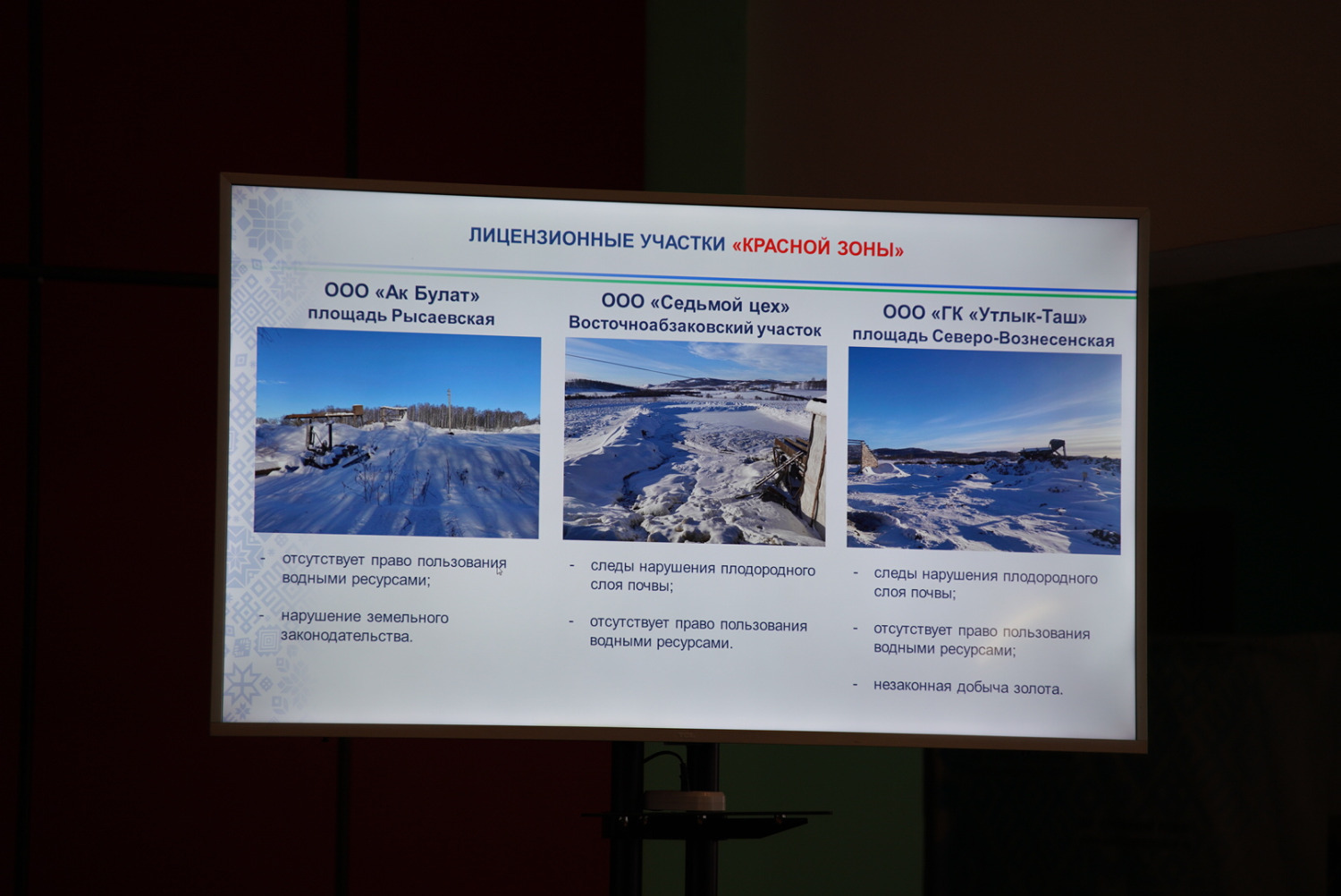 Самая большая проблема на сегодня заключается в том, что за многолетнюю историю добычи золота у нас в республике практически нет ни одного примера, когда это завершалось правильной рекультивацией. Представляете, десятки лет, 50, 40, 20 лет назад – всегда нужно было рекультивировать, но мы не имеем ни одного примера, где этот процесс был реализован. Поэтому сейчас нужны и уголовное, и судебное преследование. Этот вопрос был одним из важных.