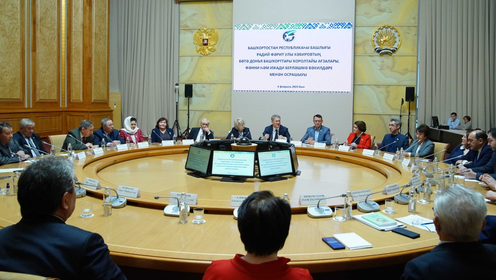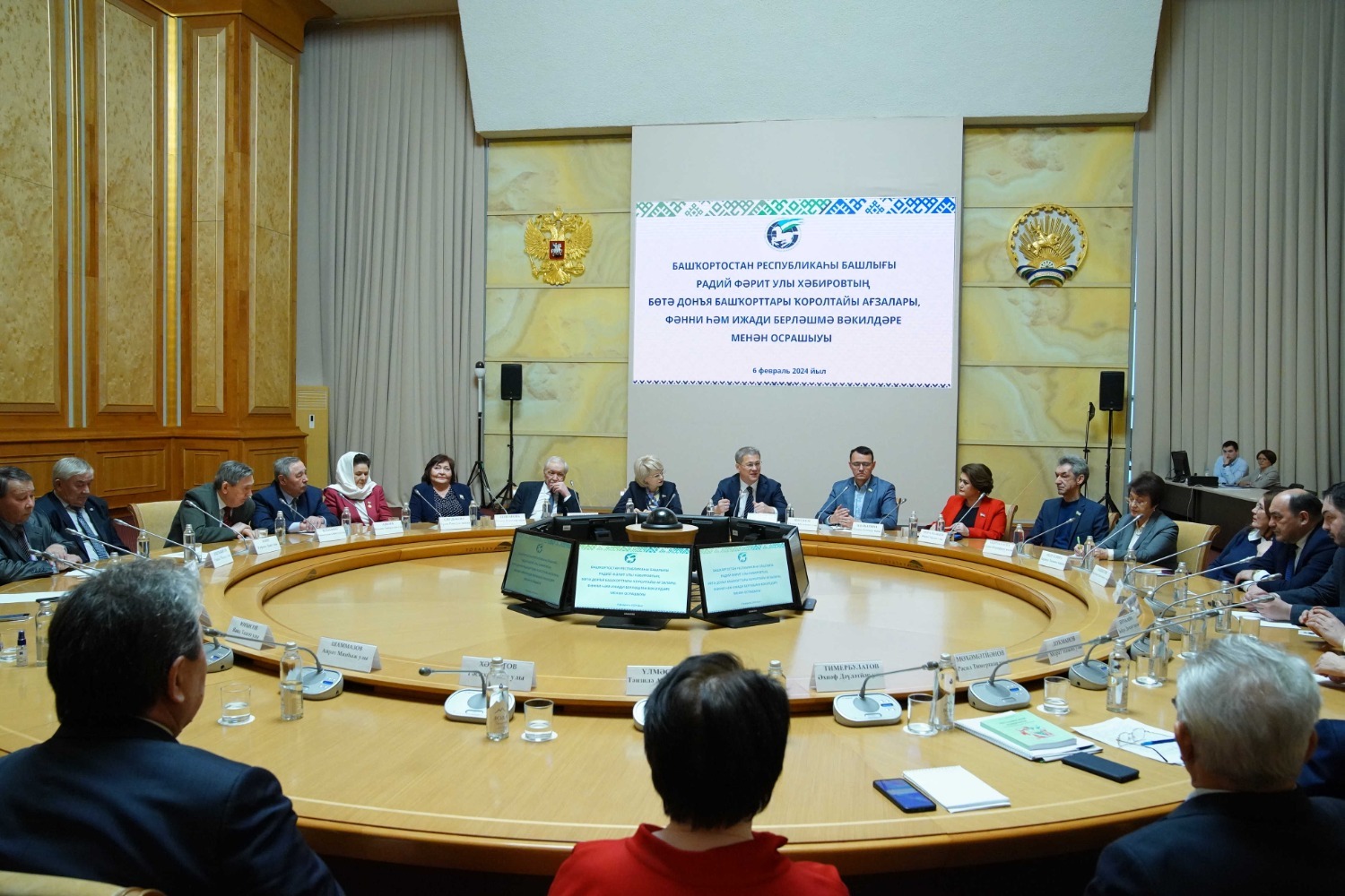 Сегодня, 6 февраля, в уфимском конгресс-холле «Торатау» Глава Башкортостана Радий Хабиров встретился с представителями Международного союза общественных организаций «Всемирный курултай башкир», а также научного и творческого сообществ республики.