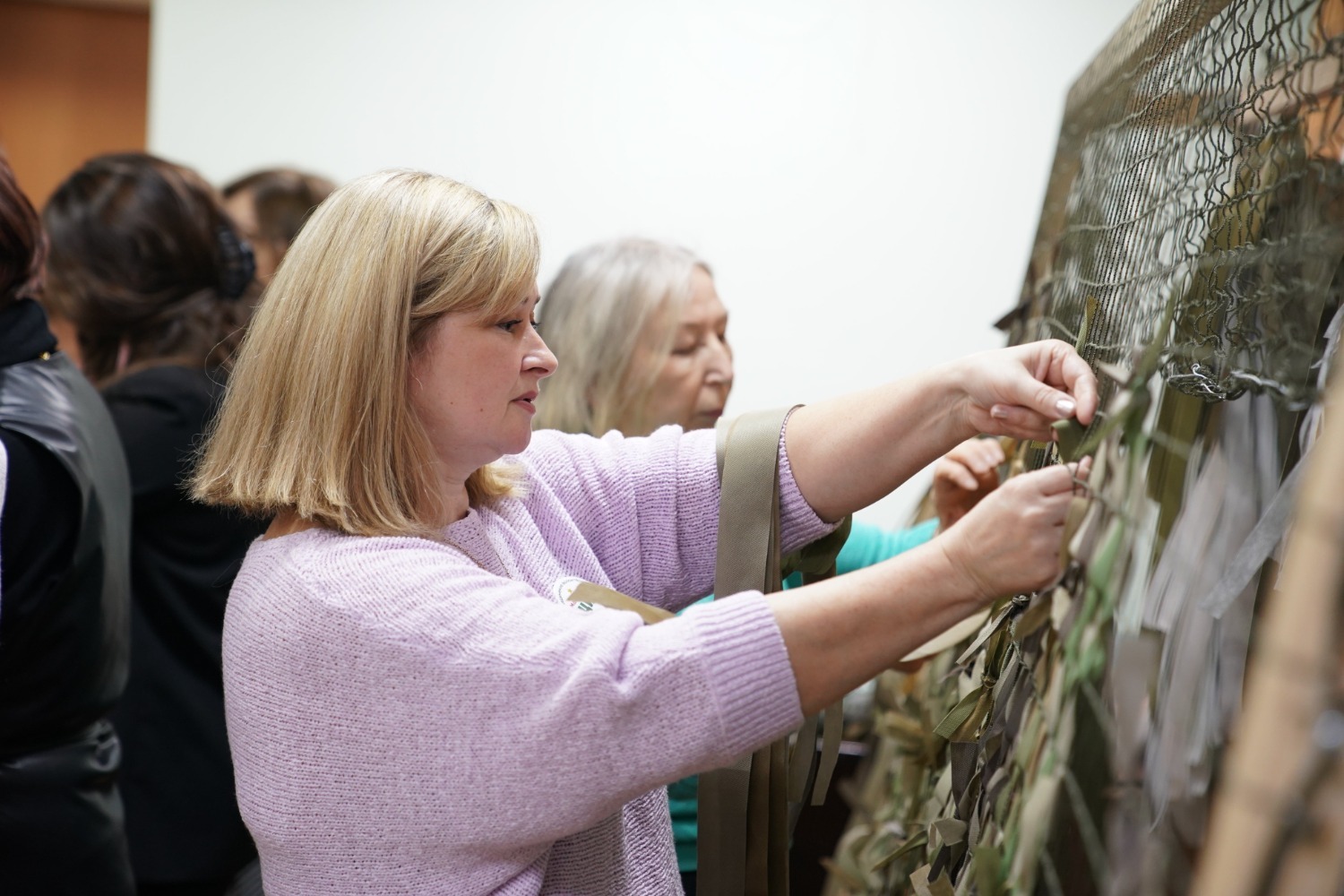 «Нам предоставили большую светлую комнату на безвозмездной основе. Здесь у нас с утра до вечера кипит работа, ежедневно работает до 30 человек. Мы уже изготовили более 1000 маскировочных сетей. Их мы отправляем нашим бойцам в составе гуманитарных грузов. Мы используем для плетения сетей спанбонд — инновационный материал. Важно, что ткань эта достаточно легкая, влагоотталкивающая и не садится. Режем мы ее на специальном станке, который соорудил муж одной из мастериц», — рассказала руководитель группы волонтеров Люция Тураманова.