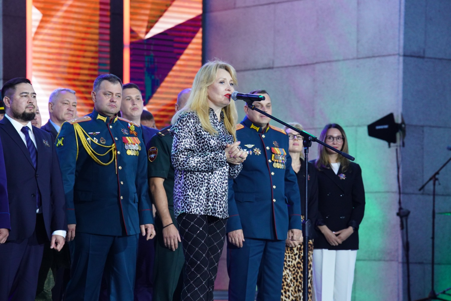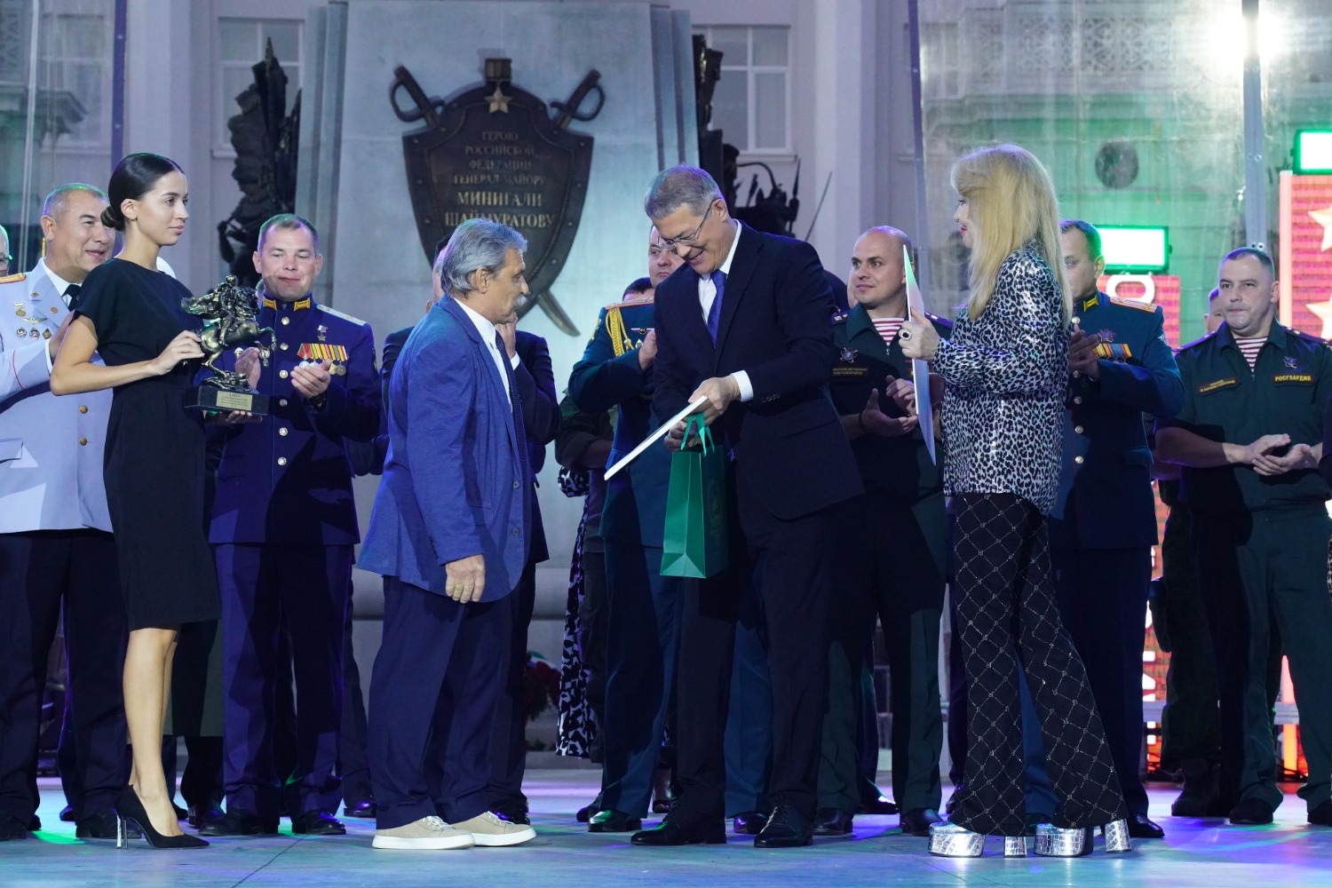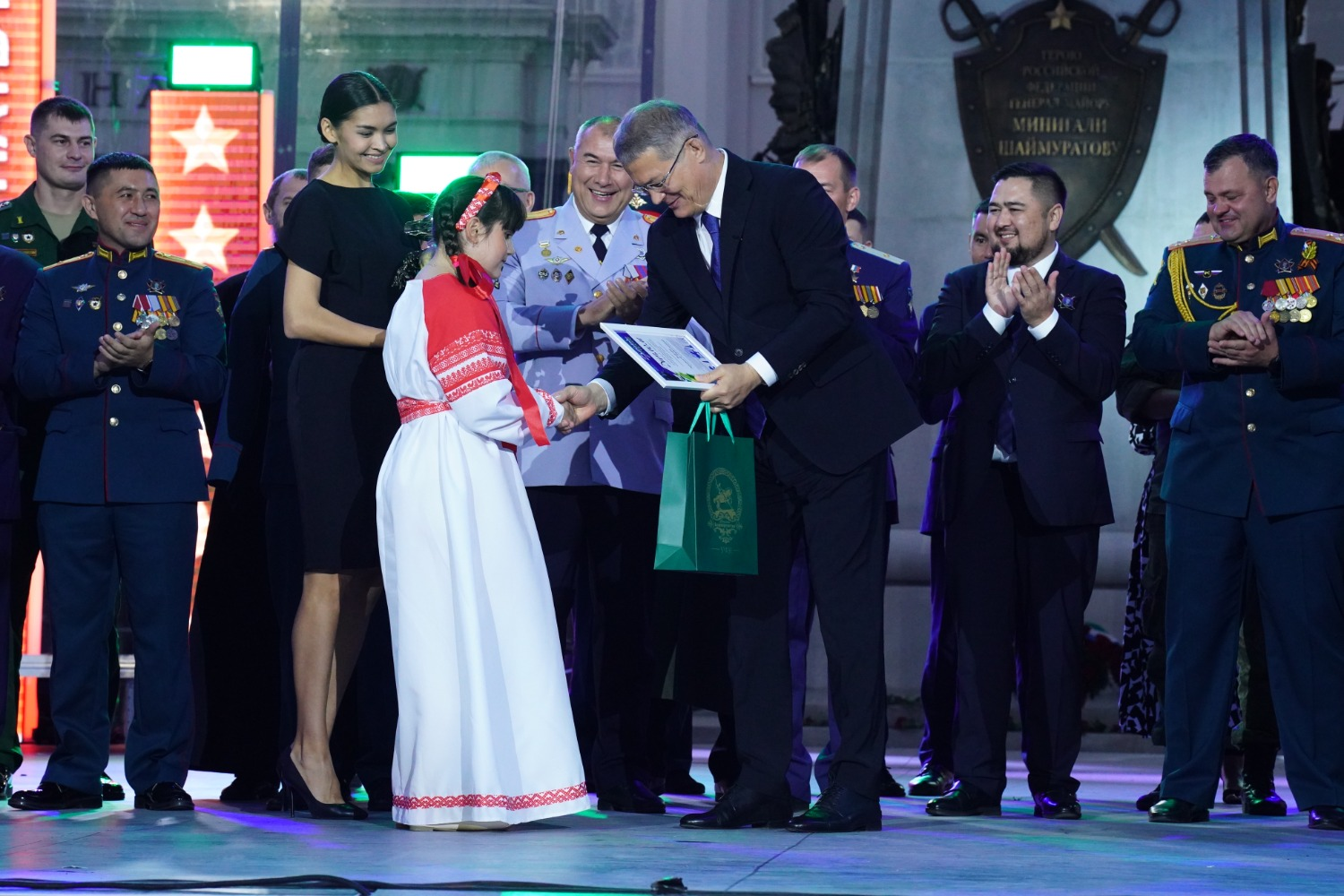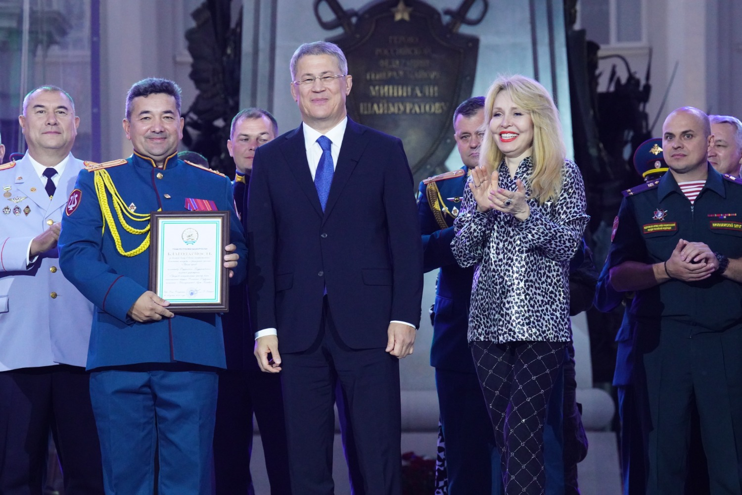 – Сегодня 125 лет со дня рождения нашего национального героя – генерал-майора Минигали Шаймуратова. Именно в этот день мы уже в третий раз проводим фестиваль патриотической песни. И правильно, что делаем это на Советской площади, где в феврале 1942 года Минигали Мингазовичу передали боевое знамя формирующейся 112-й Башкирской кавалерийской дивизии. Именно отсюда наши парни уходили на специальную военную операцию выполнять свой служебный долг, – подчеркнул руководитель региона Радий Хабиров. – Благодарю гостей и участников фестиваля за те эмоции, которые вы нам подарили. Особые слова благодарности председателю жюри Ольге Кормухиной, которую мы очень любим как артистку и уважаем как настоящего патриота своей Родины. За моей спиной – кавалеры ордена генерала Шаймуратова. Это военные и врачи, журналисты и учителя, которые в своё время сделали выбор защищать других людей, проявлять мужество и самоотверженность. И вместе с ними мы, конечно, выдержим любые испытания и вызовы времени.
