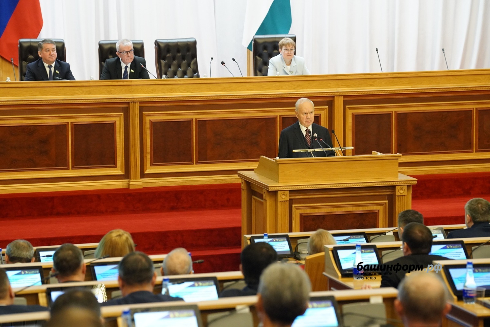 «Но дело даже не в количестве, а в том, что каждый из этих документов появляется в нужное время и решает конкретную задачу, нацеленную на повышение благосостояния жителей республики. С началом специальной военной операции одним из главных направлений депутатской работы стала помощь боевым подразделениям, всесторонняя поддержка участников СВО и членов их семей. И снова Башкортостан сработал на опережение. По инициативе Главы республики мы одними из первых среди российских регионов приняли закон о выплатах семьям погибших военнослужащих в размере двух миллионов рублей. В дальнейшем мы поэтапно приняли еще более 30 законов, направленных на поддержку участников СВО, их близких, а также экономики республики в условиях санкционного давления. В целом созданную в Башкортостане систему социальной поддержки участников СВО и членов их семей сегодня можно уверенно отнести к одной из лучших в стране. Депутаты парламента неоднократно выезжали в прифронтовые территории с гуманитарной миссией. Предприятия, возглавляемые нашими депутатами, находятся в первых рядах по сбору гуманитарной помощи. Только за год по инициативе Государственного собрания оказана поддержка в проведении СВО более чем на 150 миллионов рублей», — отметил спикер парламента.