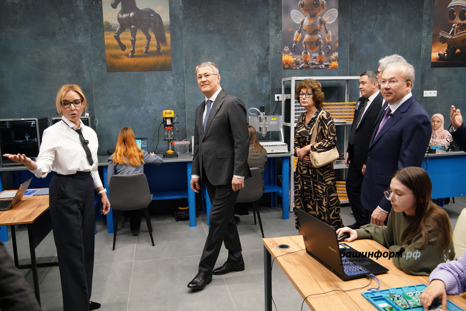 Глава республики вместе с гостями также посетили детскую лабораторию инноваций. Директор Центра опережающей профессиональной подготовки Гульнара Нургалиева пояснила, что ученики младших классов в лаборатории робототехники смогут осваивать языки программирования. А талантливые студенты и старшеклассники, изучающие робототехнику в школьных и вузовских кружках, получат уникальную возможность заняться серьезной научной работой и инженерно-техническим творчеством.