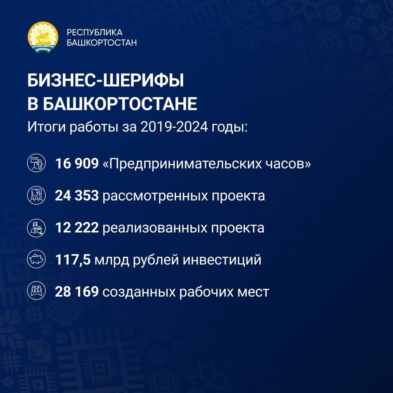 За пять лет с 2019 года бизнес-шерифы провели почти 17 тысяч «Предпринимательских часов», рассмотрели на них больше 24 тысяч проектов. Показателем работы заместителей глав по экономике является реализация бизнес-планов, и воплощение получили 12 тысяч инвестпроектов — 50%.