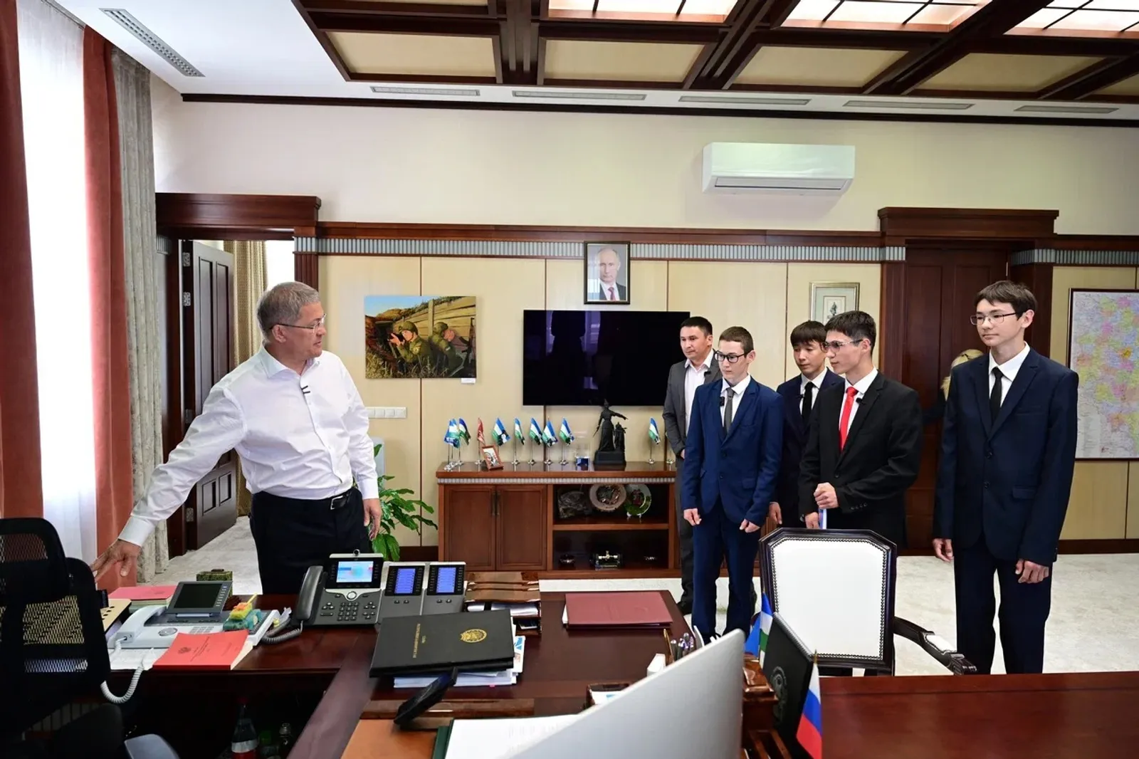 Напомним, с просьбой побывать в Доме Республики и посмотреть, где работает руководитель региона, Аскар Галимуллин обратился к Радию Хабирову во время встречи в парке «Патриот». И вот мечта подростка сбылась. Он и его одноклассники увидели рабочий кабинет Главы региона. Радий Хабиров показал, где он проводит официальные встречи с высокими гостями республики и зал оперативных совещаний.