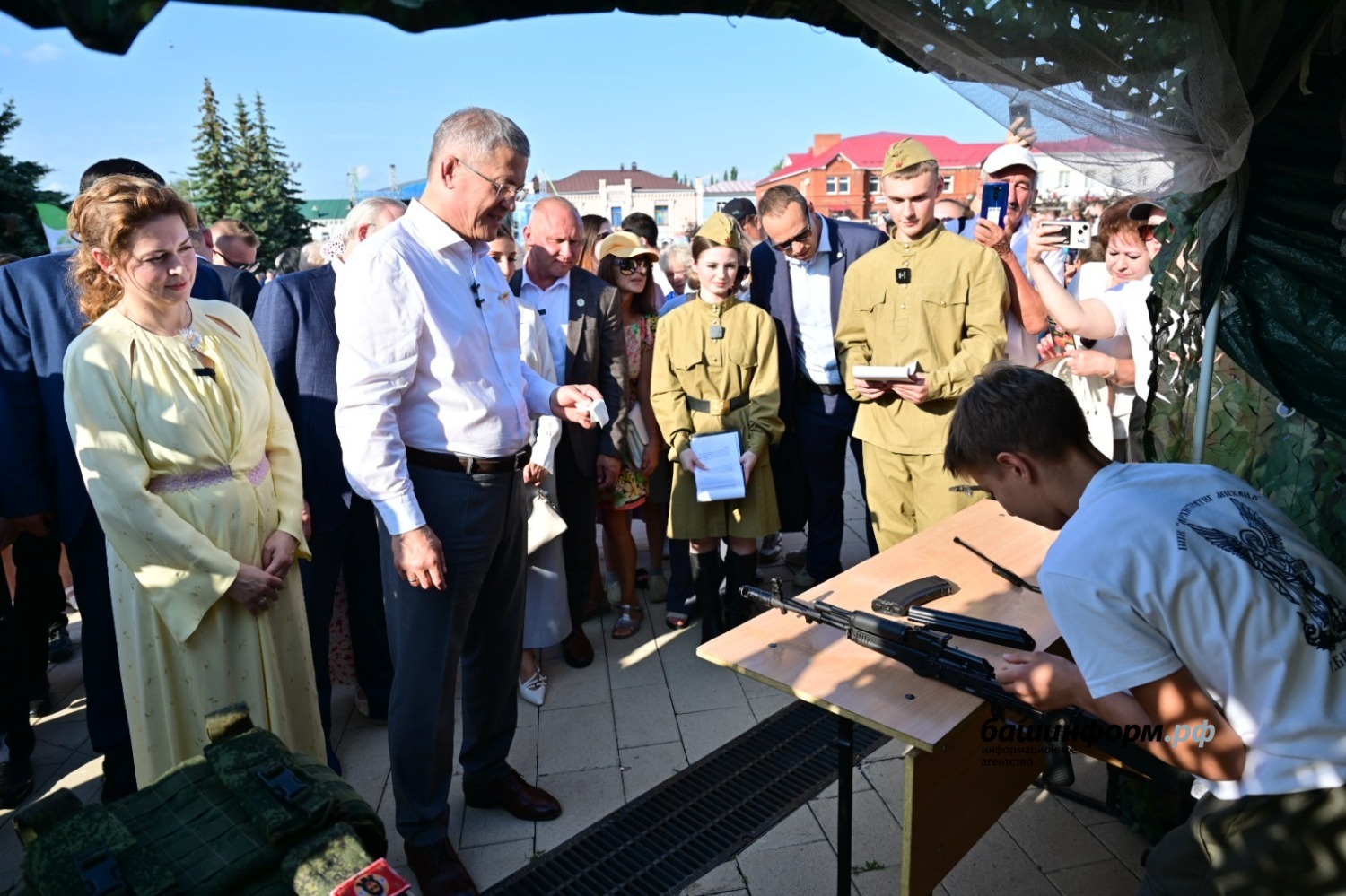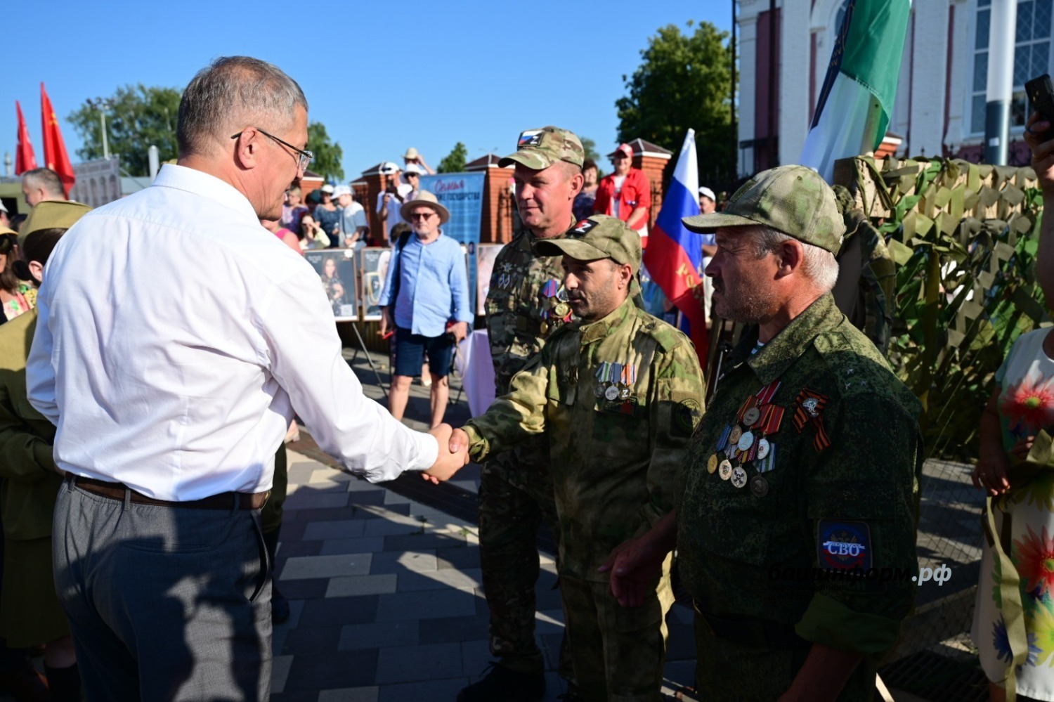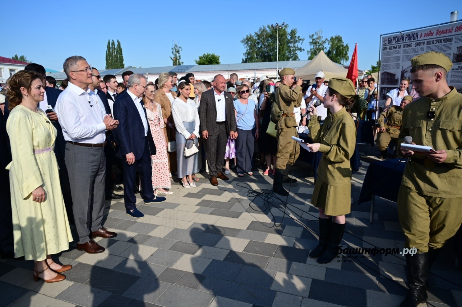 Коме того, Глава региона посетил экспозиции уличных передвижных выставок: «Бирск в годы Великой Отечественной войны» и «СВОих не бросаем». За годы Великой Отечественной войны Бирск принял, разместил и трудоустроил более 4 тысяч человек из западных областей страны. В их числе более тысячи семей начальствующего состава Красной Армии. В фонд обороны жители города и района с первых дней войны стали вносить личные сбережения, заработки, трудодни, продукты, вещи. Шесть уроженцев Бирского района удостоены высокого звания Герой Советского Союза.