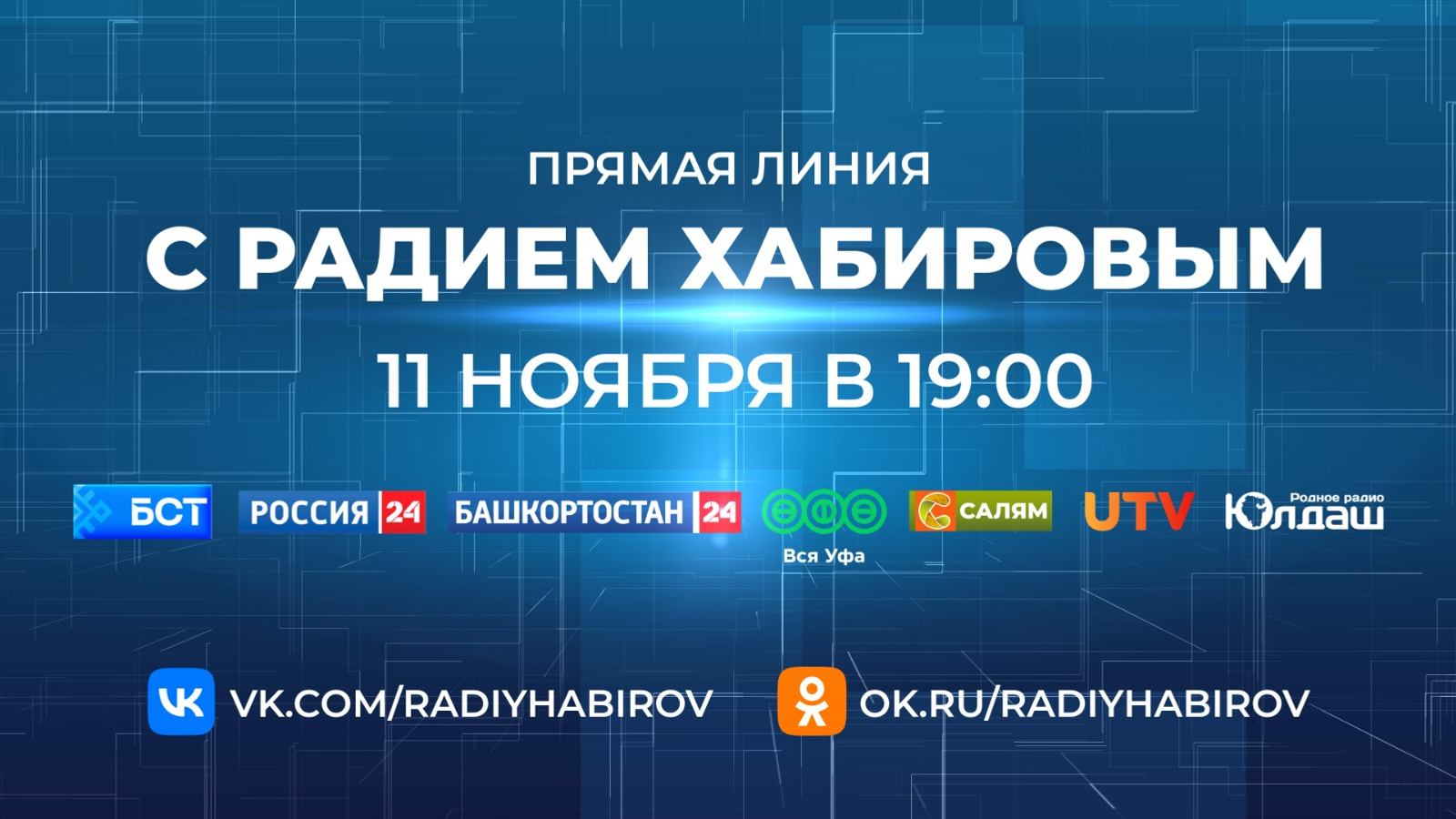11 ноября в 19.00 в прямом эфире основных СМИ республики, в социальных сетях руководителя региона состоится ежегодная Прямая линия с Главой Башкортостана Радием Хабировым.