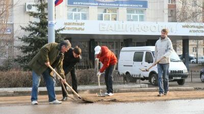 Экологическая акция в Уфе началась еще 3 апреля и согласно распоряжению городских властей продлится до 23 мая. Месячник по санитарной очистке, таким образом, будет состоять не из 30 календарных дней, а из 50. Что вполне оправдано: за зиму на городских улицах, скверах и во дворах скопилось немало мусора. А потому, убрать все за один субботник просто невозможно. Для уборки уфимских улиц подготовились основательно: техника и инвентарь, распределены территории и определены объемы уборки. Коллективы организаций и учреждений башкирской столицы, чередуясь друг с другом, выходят в эти апрельские дни на улицу с граблями, вениками и лопатами. Вот и сегодня, сотрудники информационного агентства «Башинформ», электронной газеты «Башвест», рекламного еженедельника «Курьер Башкортостана», Управления по делам печати, издательства и полиграфии при Правительстве РБ дружно вышли на свой первый субботник по уборке прилегающей территории. За несколько часов ударной работы площадь и газоны перед зданием ОАО «Башинформ» были вычищены почти до блеска. Напомним, что в Уфе дни 24 апреля и 15 мая объявлены общегородскими субботниками.
