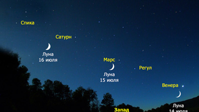 14 июля к ним присоединится тонкий серпик молодого месяца, рожки которого будут повернуты влево - в сторону от зашедшего Солнца. Он окажется рядом с самой яркой из планет - Венерой. Менее яркая, но тем не менее достойная пара Марс и Сатурн светят левее и выше. А вот Меркурий расположится справа, ближе к северо-западу. Он в этот день будет виден на такой же высоте над горизонтом, что и Луна. Попробуйте поискать его у самого горизонта сразу после 23 часов на еще светлом вечернем небе.