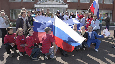 Автопробег начался на Советской площади, а финишировал у Конгресс-холла раздачей бело-сине-красных ленточек и информационных листовок с историей флага и текстом гимна страны.