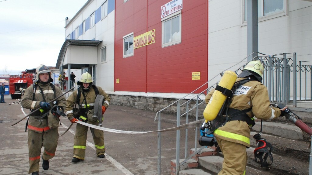 Уфимские пожарные провели тактические учения на Демской торговой базе. В «тушении» участвовали пять подразделений. Сотрудники МЧС отработали вместе с персоналом торгового комплекса порядок действий при пожаре — кто и куда должен позвонить, и что делать до приезда бригады.
