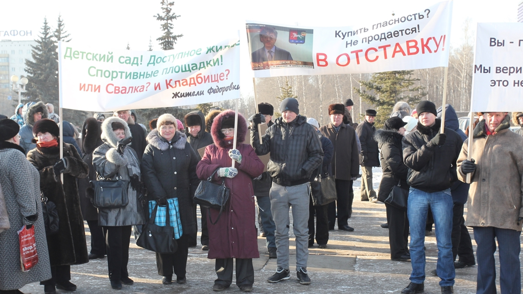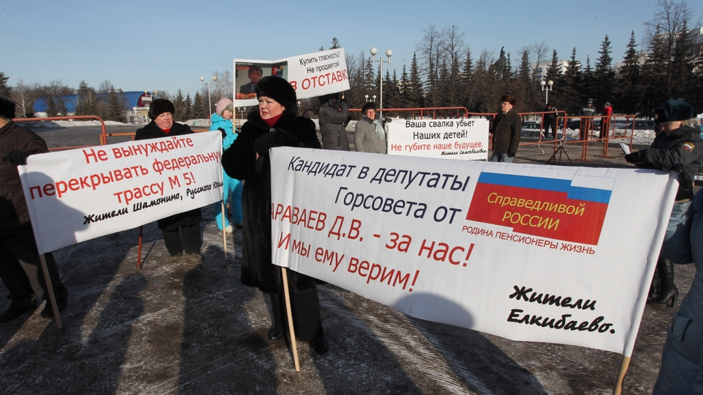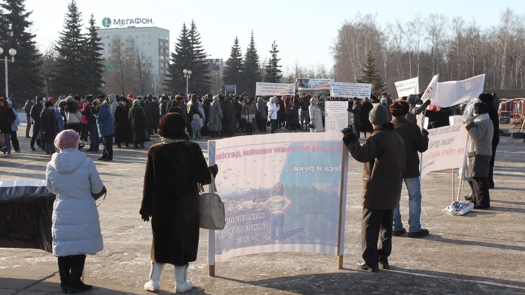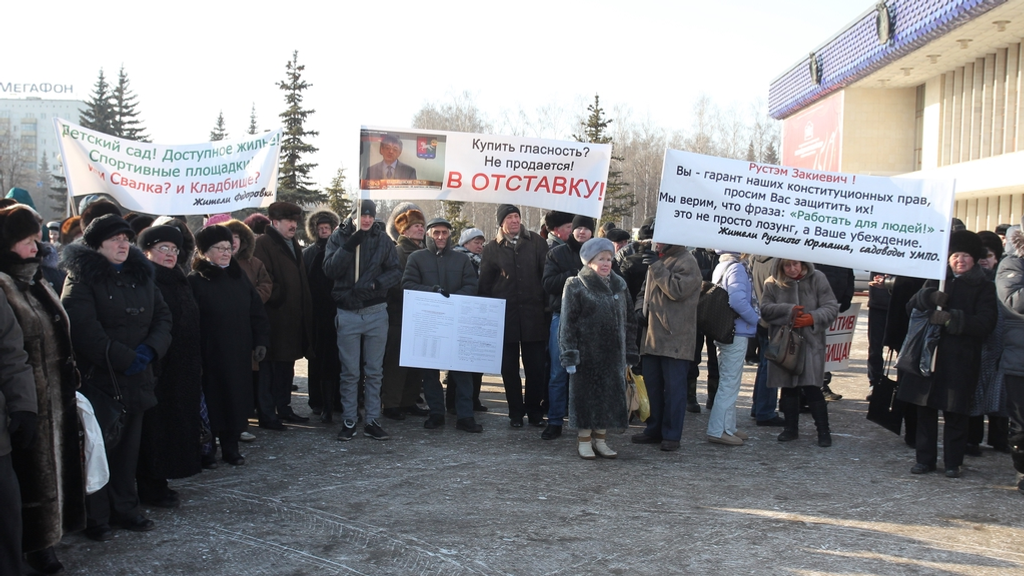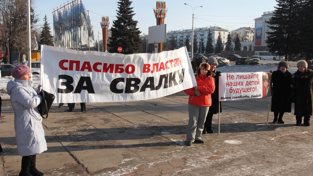 Жители Зауфимья организовали пикет на площади имени В.И.Ленина перед Русским драматическим театром. Причина – постановление столичной администрации, согласно которому вблизи населенных пунктов Федоровка, Самохваловка, Елкибаево, Русский Юрмаш, Карпово, Шамонино в ближайшие годы должны появиться кладбище и полигон твердых бытовых отходов.