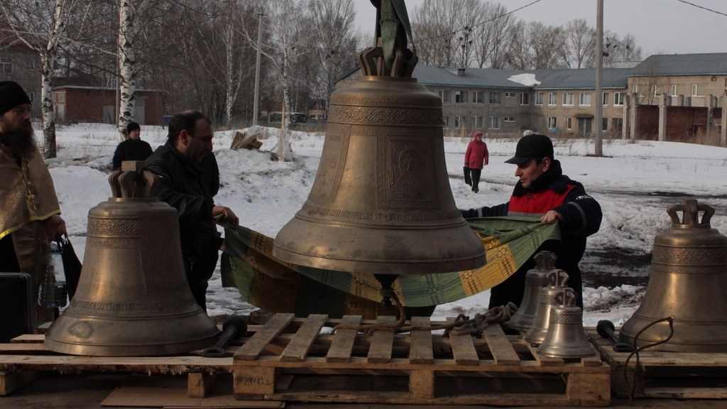 Сегодня - очередное значимое событие для жителей поселка. Семь колоколов были освящены и заняли свое место на николаевской колокольне. Отлиты они известными российскими мастерами в Каменск-Уральске. Самый большой колокол - Благовест. Он весит 326 килограммов Остальные поменьше – от 164 до шести килограммов.