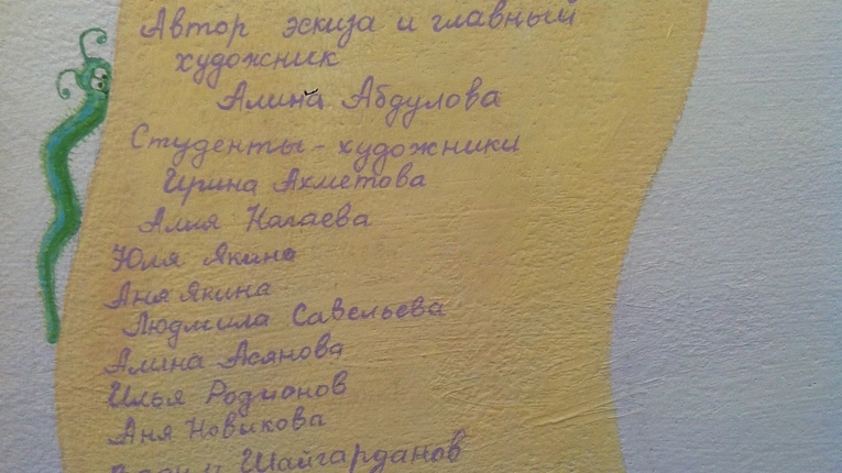 Студенты-художники из Уфимского филиала МГГУ имени М.А.Шолохова создали в детском приюте фреску. Настенная роспись «Страна детской мечты» появилась в столичном социальном приюте для детей и подростков. Перед автором фрески – выпускницей специальности «Изобразительное искусство» художественно-графического факультета Алиной Абдуловой стояла задача: создать картину, которую было бы интересно рассматривать детям. Каждый ребенок выбрал себе «друга» - сказочного персонажа. Отбор образа происходил по признаку эмоционального сходства, или, наоборот, по принципу восполнения недостающих качеств. Роспись выполняли волонтеры-студенты художественно-графического факультета Ирина Ахметова, Алия Нагаева, Юлия Якина, Анна Якина, Людмила Савельева, Алина Асянова, Илья Родионов, Анна Новикова, Вадим Шайгарданов.