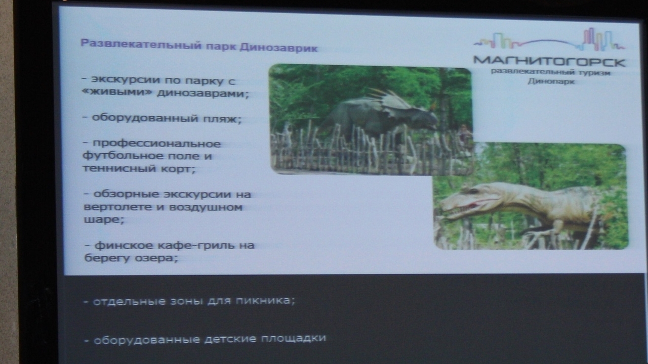 Магнитогорский курорт «Банное», представленный на сегодняшней презентации, обозначил себя не только как «место встречи Европы и Азии», но и предложил переместиться из настоящего в эпоху огромных ящеров - в парк «Динозаврик», где можно, без опасения быть съеденным монстрами, устроить пикник в экзотической стране. Довольными останутся как дети, так и взрослые.