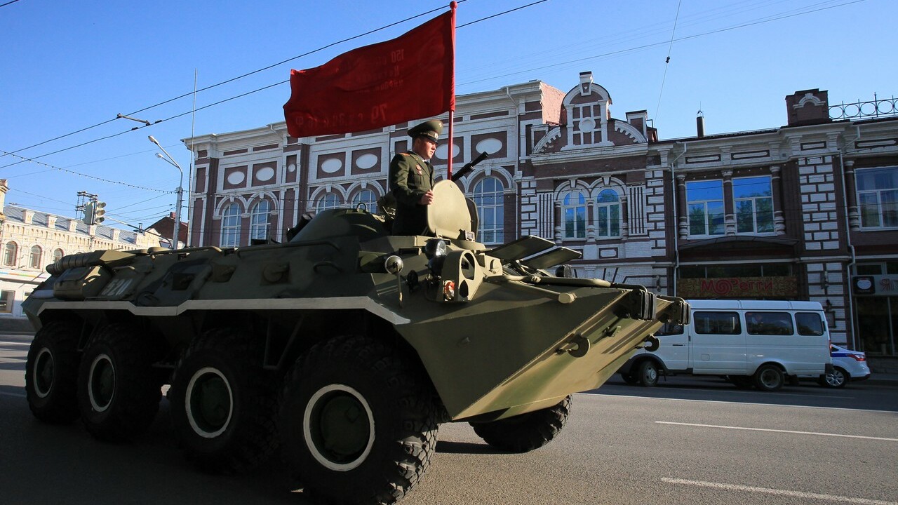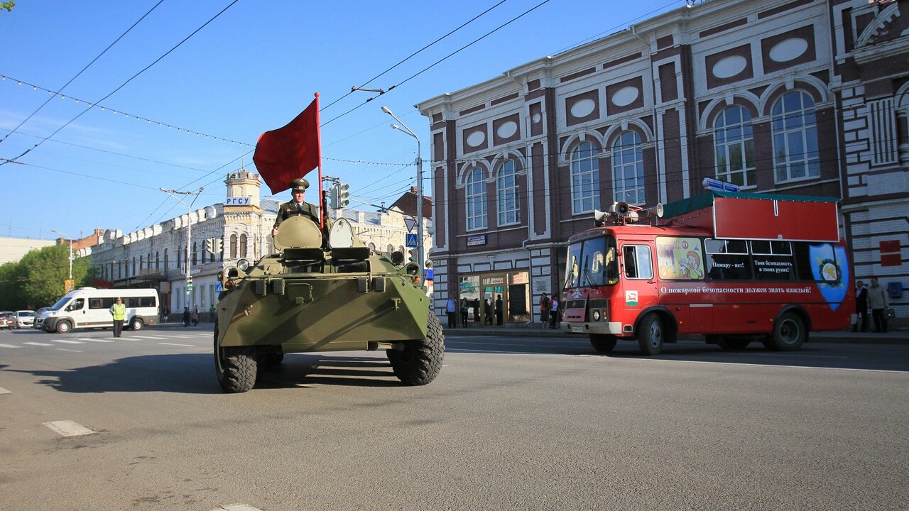 В четверг, 16 мая, Знамя Победы установили на бронетранспортере и в сопровождении почетного эскорта в развернутом виде провезли по улицам города от Дома офицеров до Русского драматического театра РБ, где проходит церемония награждения победителей и призеров Республиканской олимпиады школьников на Кубок имени Юрия Гагарина.