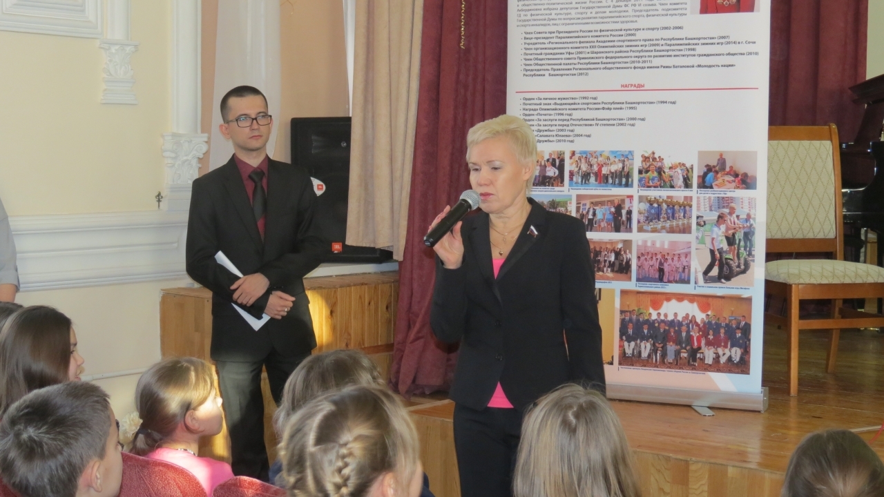 Депутат Госдумы РФ от Башкортостана, член Комитета по физической культуре, спорту и делам молодежи Рима Баталова провела «Олимпийский урок» в уфимской гимназии №3 им. А.М.Горького. Легендарная спортсменка выступила перед учениками пятых классов, рассказав им об исторических аспектах становления олимпийского движения, а также о своем жизненном пути и достижениях.
