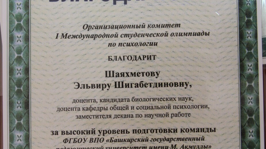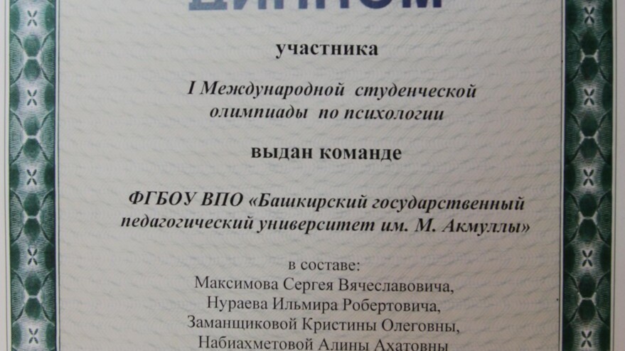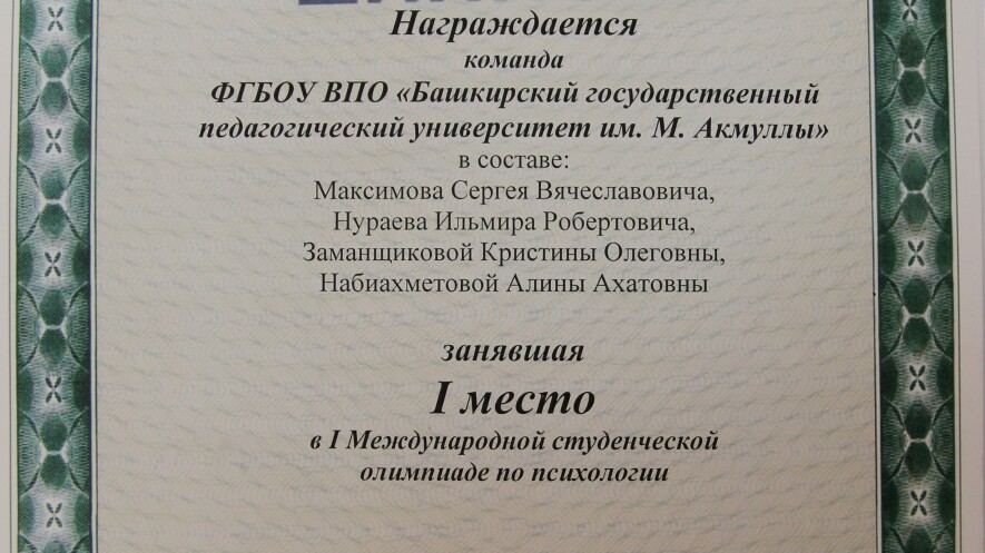 Команда факультета психологии БГПУ им. М.Акмуллы в составе студентов 3-го курса Сергея Максимова, Ильмира Нураева, Кристины Замащиковой и Алины Набиахметовой под руководством заместителя декана по научной работе доцента Эльвиры Шаяхметовой заняла первое место на Международной студенческой олимпиаде по психологии среди 15 команд ведущих вузов России и Республики Казахстан.