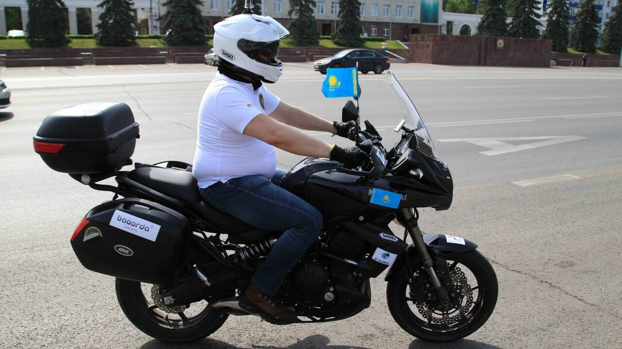 Финиширует команда из трех мотоциклистов — Султана Серика, Дияза Байсеитова и Асхата Жакабаева — в Астане 6 июня, в день столицы.