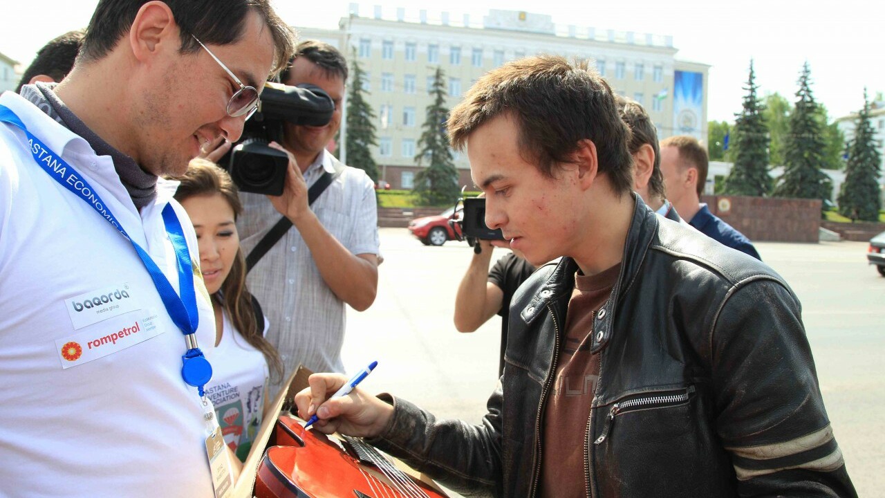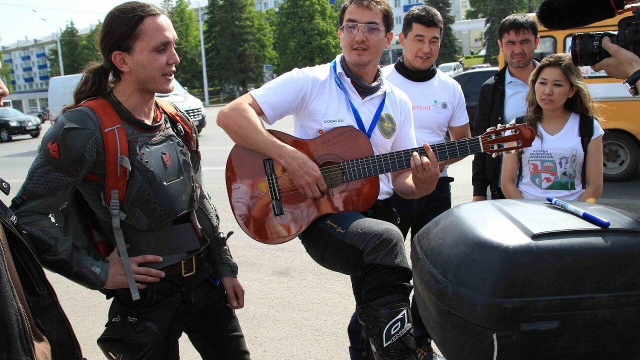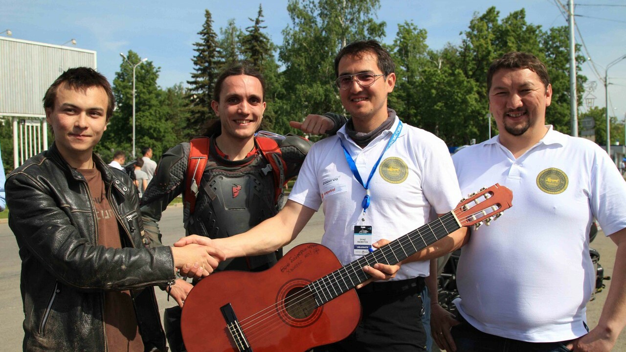 Уфимские байкеры подарили гостям гитару с автографом — пожеланием счастливой дороги, и те тут же исполнили под нее песню путешественников — бременских музыкантов, романтиков дороги.