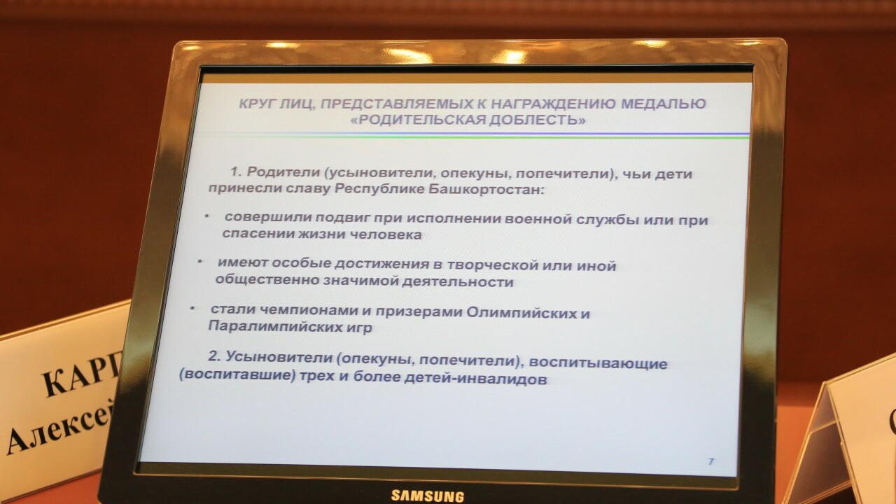 Законопроектом предусматривается награждение медалью «Родительская доблесть» родителей, воспитавших детей, заслуги которых прославляют Башкортостан. Достижения могут быть не только в спорте, творчестве, военной службе, будут отмечены также героические поступки в обычной жизни.
