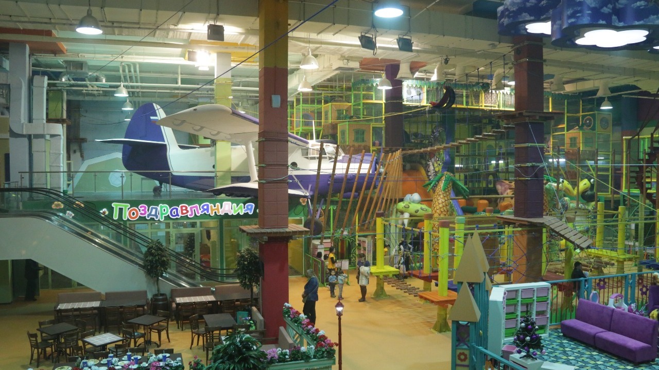 В середине комплекса приземлился настоящий самолет Ан-2. Под его крылом находится «Поздравляндия». Это несколько комнат-трансформеров, созданных для проведения детских праздников, дней рождения. Родители могут дополнительно заказать специальную праздничную программу.
