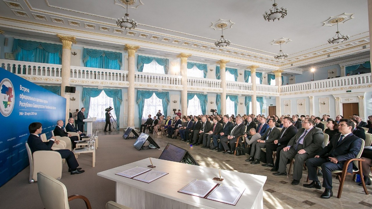 УФА, 20 мар 2015. /ИА «Башинформ», Илья Спиридонов/. 20 марта в Уфе состоялась встреча представителей официальных и деловых кругов Башкортостана и Челябинской области, в рамках которой руководители соседствующих регионов Рустэм Хамитов и Борис Дубровский провели презентацию промышленного и инвестиционного потенциала своих территорий.