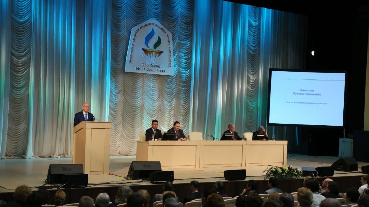 УФА, 28 апр 2015. /ИА «Башинформ», Илья Спиридонов/. 28 апреля в Уфе Глава Башкортостана Рустэм Хамитов выступил на пленарном заседании III съезда Ассамблеи народов Республики Башкортостан. В работе съезда принимают участие заместитель начальника Управления Президента России по внутренней политике Михаил Белоусов, заместитель полномочного представителя Президента России в Приволжском федеральном округе Олег Мельниченко, заместитель председателя Совета Ассамблеи народов России – председатель исполкома Ассамблеи народов России Назиржон Абдуганиев, а также представители федеральных и региональных органов власти, общественных и религиозных организаций.