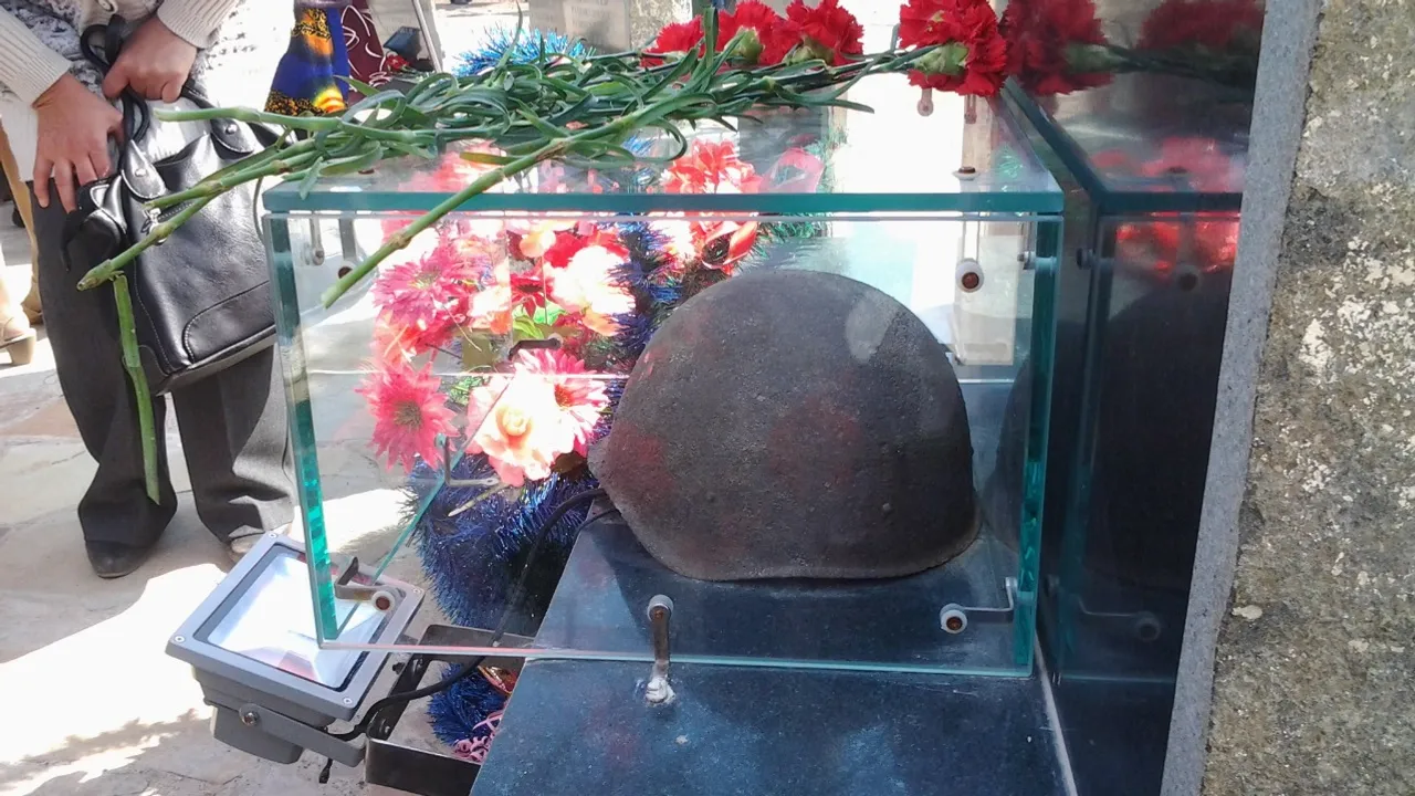 Справка. Обелиск - семь вертикально установленных камней, на которых выбиты фамилии погибших и вернувшихся с войны каркалинцев. Камни для обелиска привезены с Сибайского месторождения, а плитняк, которым покрыто основание, - из села Темясово Баймакского района. У центрального камня - каска в стеклянном кубе, привезенная из Тербунского района Липецкой области (Курская дуга) Вилсуром Нафиковым и Филусом Гильфановым. Предположительно, каска принадлежала одному из бойцов прославленной 112-й Башкирской кавалерийской дивизии, воевавшей на этой территории.