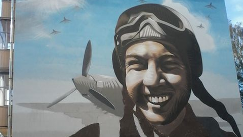 УФА, 7 май 2015. /ИА «Башинформ», Гульфия Акулова/. К 70-летию Победы в Великой Отечественной войне уфимские художники-граффитисты создают новые патриотические рисунки. Портрет дважды Героя Советского Союза, легендарного летчика Мусы Гареева появился на фасаде дома по улице Худайбердина, 4, где он проживал. Летчик изображен на фоне штурмовика Ил-2, юбилейная цифра «70» выложена маленькими самолетиками. Автор рисунка - известный столичный мастер стрит-арта Олег Кайбышев. Сейчас художник заканчивает работу над портретом четырежды Героя Советского Союза, Маршала Георгия Жукова. Новое граффити будет украшать фасад дома №2 на улице имени известного военачальника.