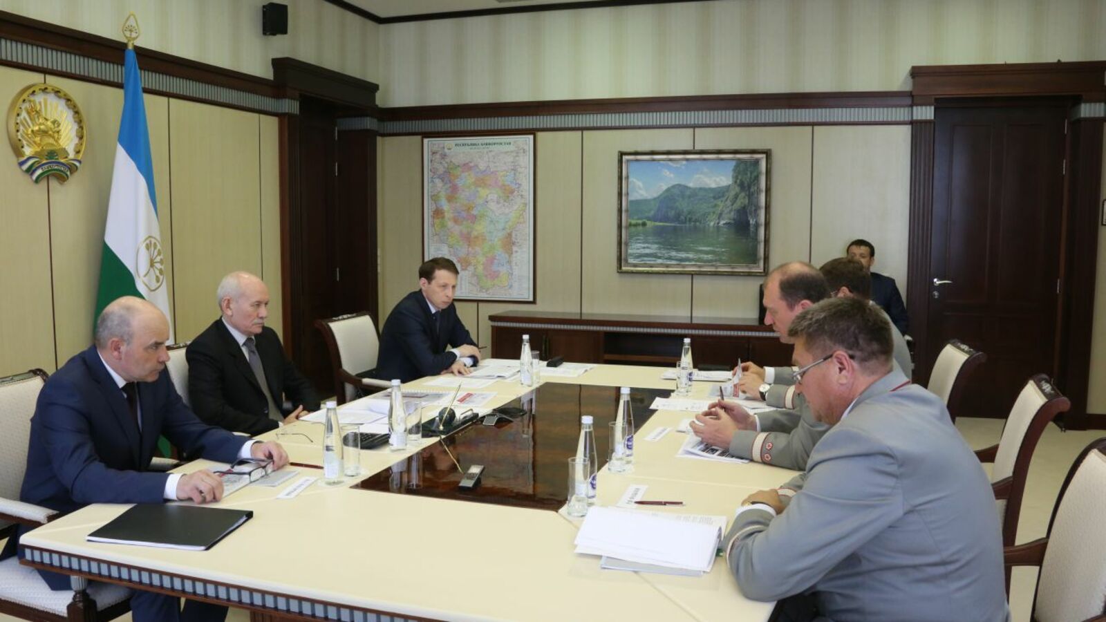 УФА, 19 май 2015. /ИА «Башинформ», Илья Спиридонов/. 19 мая в Доме Республики Глава Башкортостана Рустэм Хамитов провел встречу с начальником Куйбышевской железной дороги – филиала ОАО «РЖД» Сергеем Соложенкиным. Стороны обсудили ход подготовки инфраструктуры Уфимского железнодорожного узла к проведению саммитов ШОС и БРИКС, а также вопросы организации пригородных пассажирских перевозок.