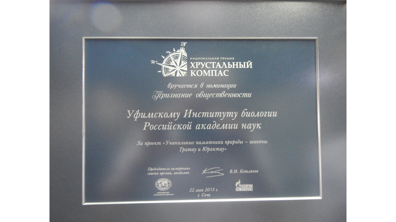 Хрустальная статуэтка «Хрустальный компас» была вручена руководителю проекта, директору ИБ УНЦ РАН Александру Мелентьеву и председателю отделения РГО в Башкортостане Камилю Зиганшину.