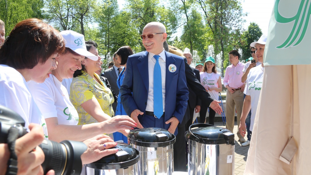 У стенда санатория «Зеленая роща» Глава республики попробовал фиточаи «Витаминный» и «Успокаивающий», а затем поучаствовал во флешмобе для детей, подростков и студентов «Зарядка», организованном благотворительным фондом «Мархамат».