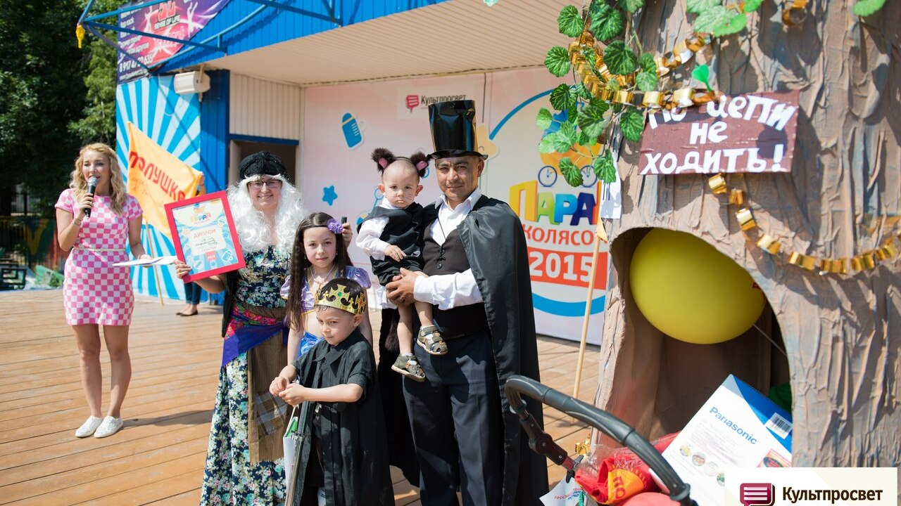 УФА, 24 июн 2015. /ИА «Башинформ», Гульфия Акулова/. Гран-при «Парада колясок», который состоялся в минувшие выходные в Уфе, получила семья Миндиахметовых. Они представили коляску «Лукоморье» по мотивам сказки Пушкина. Коляска была преобразована в огромное дерево с дуплом, а вся семья облачилась в костюмы сказочных героев.