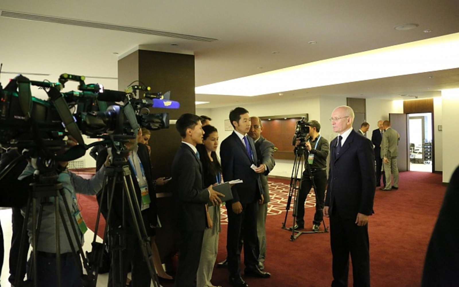 УФА, 7 июл 2015. /Алим Фаизов/. 7 июля в Уфе Глава Башкортостана Рустэм Хамитов дал интервью журналистам телекомпаний Республики Казахстан «Хабар», «Казахстан» и «24 KZ», сообщили в пресс-службе Главы региона.