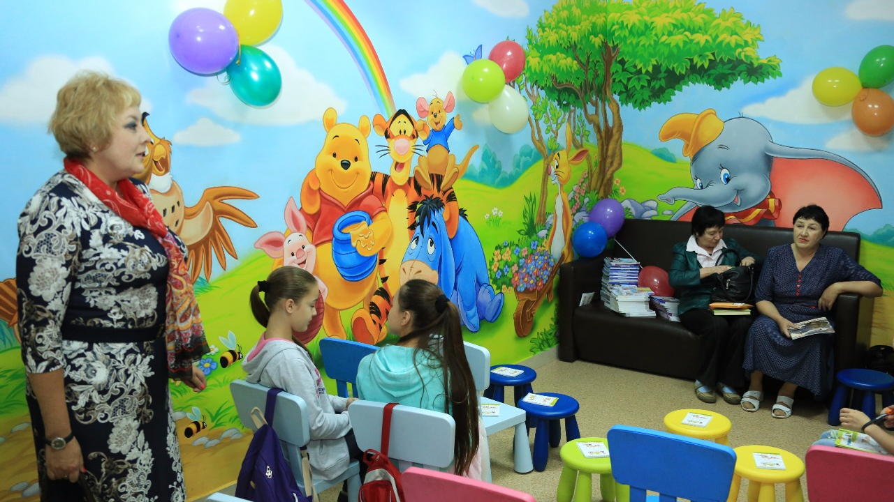 В детской комнате установлен экран с информацией о свободных окнах, поэтому пропустить свою очередь к нужному специалисту, зачитавшись с ребенком интересной книжкой, невозможно.