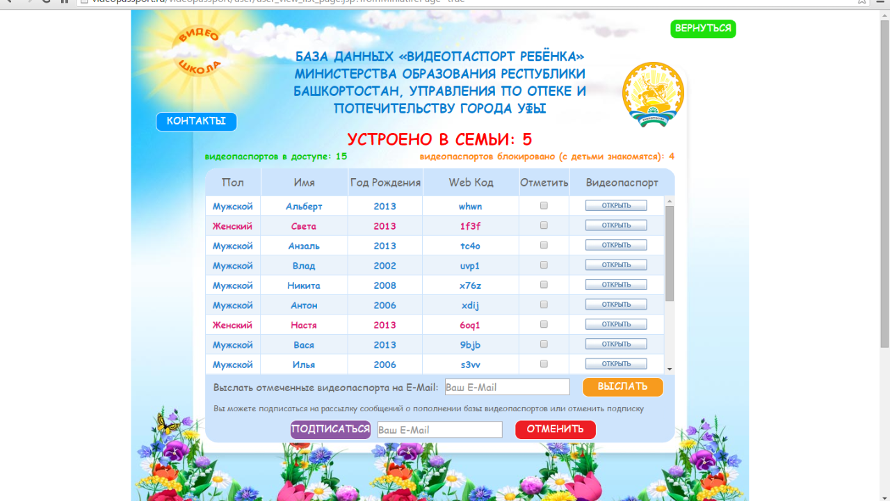 Как рассказали в Управлении по опеке и попечительству Уфы, с появлением подробной информации о детях-сиротах на такой масштабной площадке, как «Видеопаспорт» шансы найти семью у малышей увеличились в несколько раз. После выпусков передач по телевидению в Управление поступило большое количество звонков из разных уголков страны от граждан, пожелавших удочерить не только этих девочек. В настоящее время одного ребенка из Уфы усыновили, четверо устроены в приемные семьи. Четверым детям оформляются документы на усыновление. Таким образом, проект «Видеопаспорт» помог обрести родителей девяти сиротам. Среди них семь малышей младше пяти лет, еще двум ребятам - 7 и 9 лет. Примечательно, что за пределы республики с новыми родителями уехали трое детей - это Краснодарский край, Москва, Ямало-Ненецкий автономный округ. Шестерых взяли на воспитание жители Башкортостана.