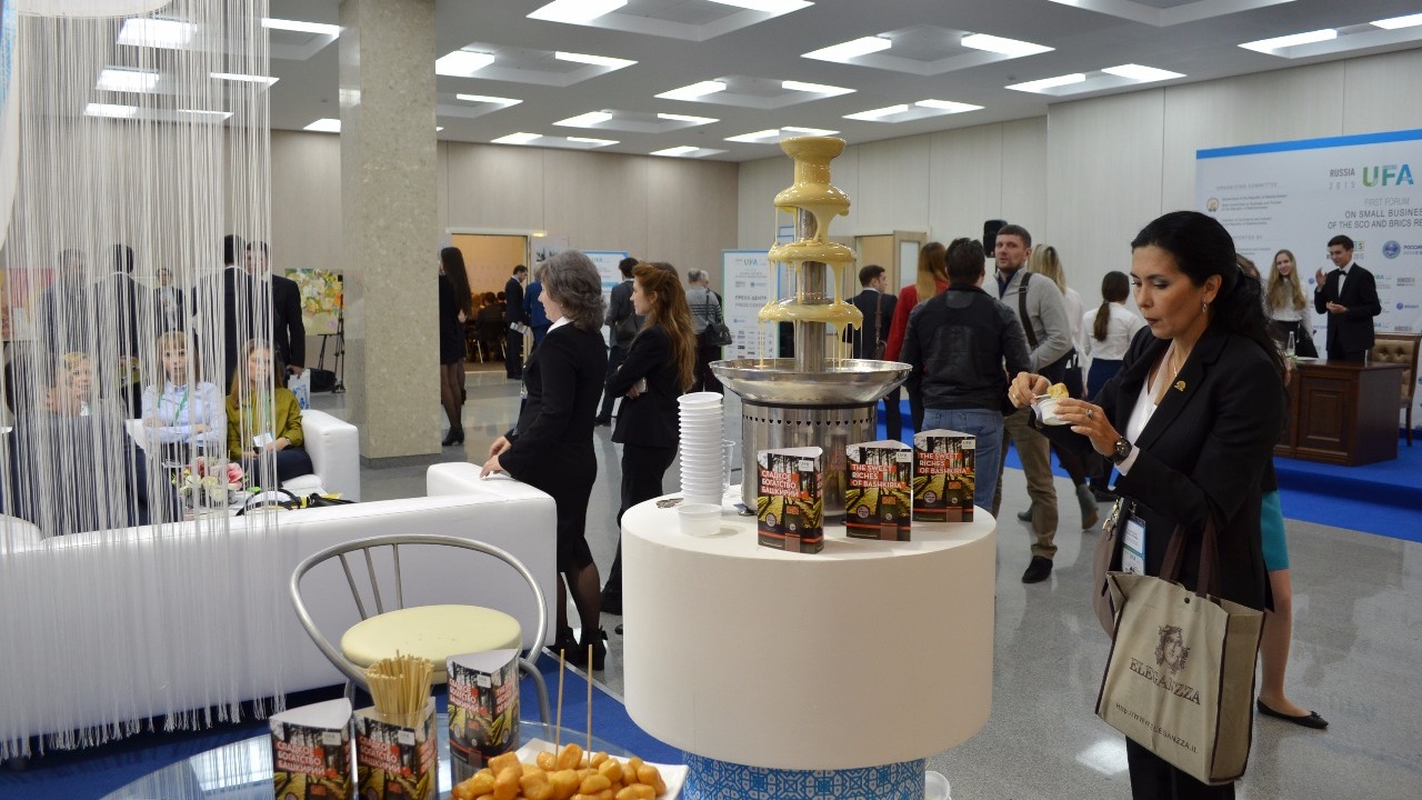 «Сине-белый стенд Башкортостана мы делали с учетом пожеланий Торгово-промышленной палаты республики. Он получился легким, воздушным и светлым. Функция стенда заключается в том, чтобы наши гости смогли получить интересующую их информацию о республике. Здесь же можно было интерактивно выйти на биржу контактов и назначить встречу с бизнес-партнерами. В просторной и удобной зоне переговоров гости форума общались в формате В2В. На стенде также представлена карта мира, где каждый участник мог отметить свою страну, таким образом, «вырисовывалась» география стран-участниц. Что касается медового фонтана, то эта идея новая и многим пришлась по душе. Композиция нулевого километра символично изображает то, что Уфа - это точка отсчета как в географическом, так и бизнес-плане. Стрелочками показаны направления и километраж до стран ШОС и БРИКС. Атрибутика с символикой форума является фирменной - и дизайн, и цветовая гамма остались от саммитов ШОС и БРИКС. В едином стиле выполнены стенды, пресс-воллы, бейджи, указатели, блокноты, ручки. От прошедших саммитов осталась и большая юрта для переговоров лидеров стран-участниц. Безусловно, особое настроение уюта и гостеприимства придали цветочные композиции, которыми занимались сотрудники ТПП республики. Цветы украсили бизнес-площадки и холл комплекса», — рассказала директор выставочной компании «Премьер-Экспо» Марина Бочарникова.