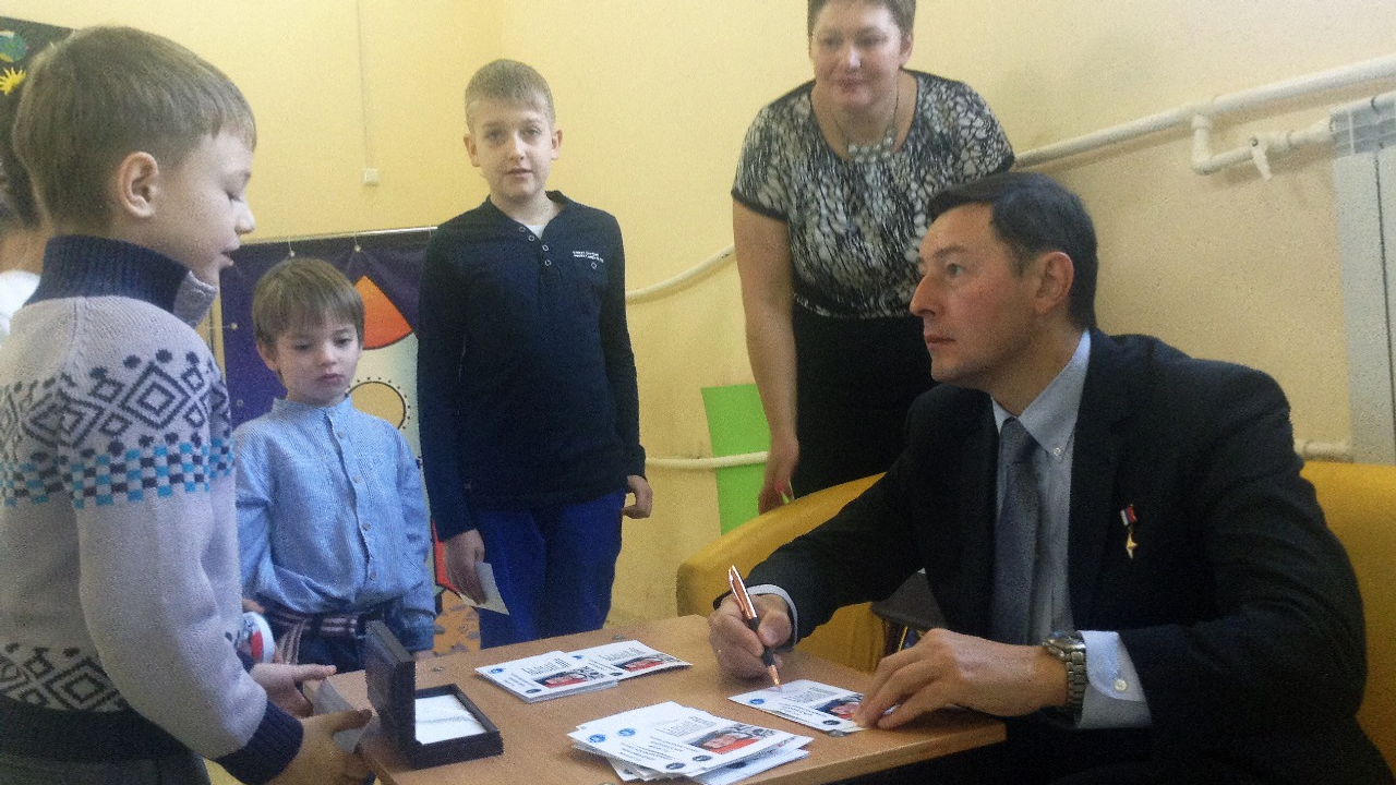 УФА, 20 ноя 2015. /ИА «Башинформ», Артур Басыров/. Посетивший Уфу летчик-космонавт Сергей Ревин встретился с воспитанниками детского развивающего центра «Я — гений». Юные дарования смогли пообщаться с гостем, задать интересующие вопросы, взять автограф и сфотографироваться.