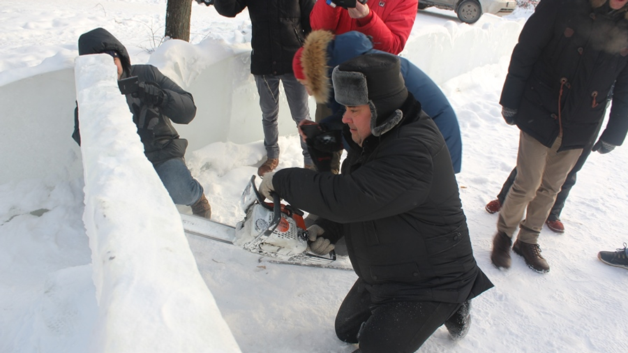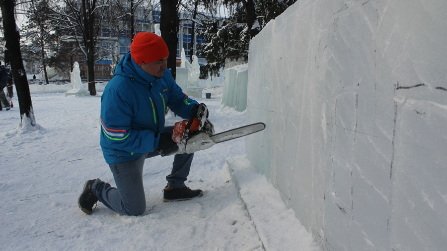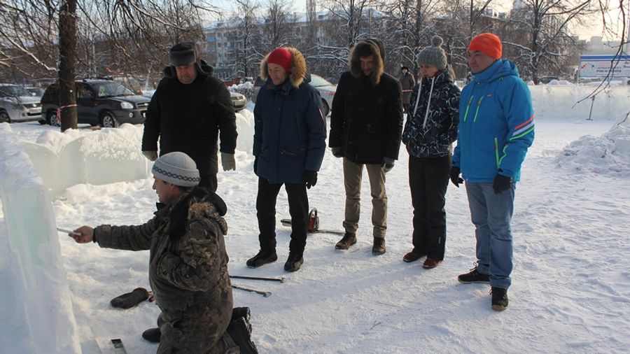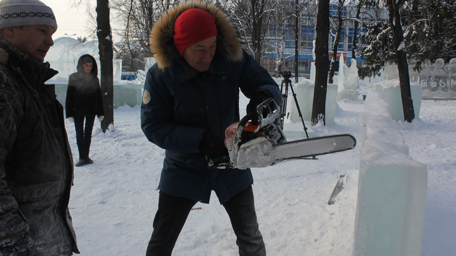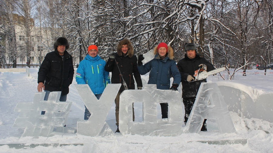 УФА, 19 дек 2015. /ИА «Башинформ», Олеся Серёгина/. Уфимские блогеры Раис Габитов, Павел Степанов, Шамиль Валеев и глава администрации Советского района Урал Кильсенбаев вырезали изо льда арт-объект #УФА. Помогал им в этом художник Ильшат Буляков. Скульптура установлена на площади перед Уфимской детской филармонией (ДК РТИ), где ежегодно строится ледовый городок. На этот раз он посвящен Году кино, поэтому, помимо арт-объекта #УФА, городок украшают ледяные скульптуры персонажей из сказок и мультфильмов.