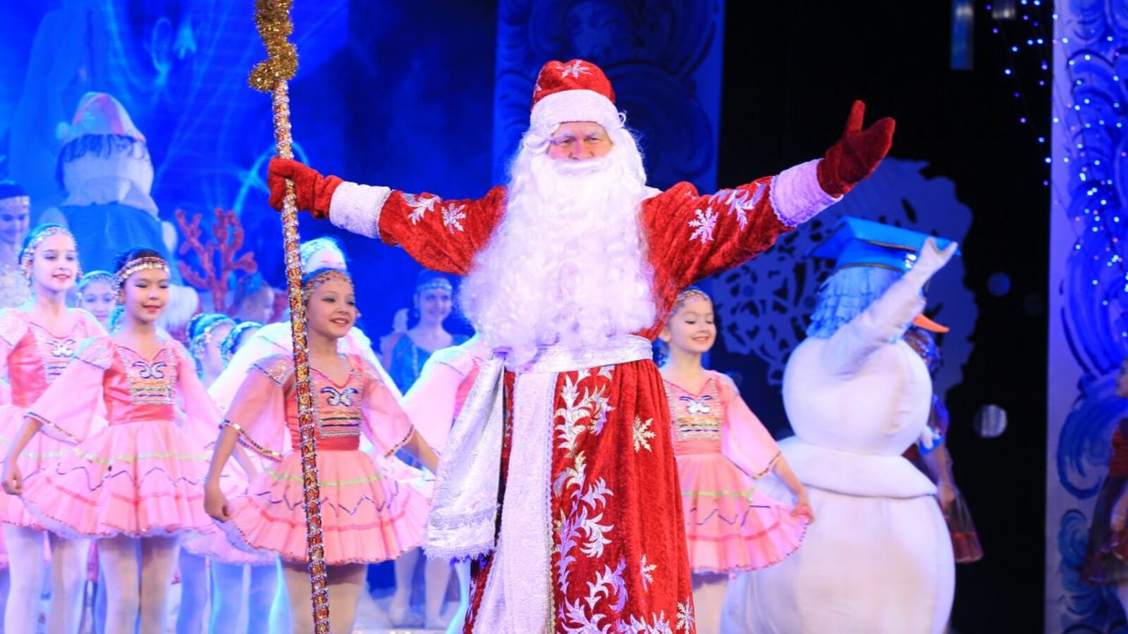На главном детском новогоднем утреннике в ГКЗ «Башкортостан» артисты провели для детворы традиционный торжественный хоровод вокруг зеленой красавицы с Дедом Морозом и сказочными персонажами.