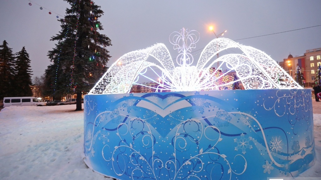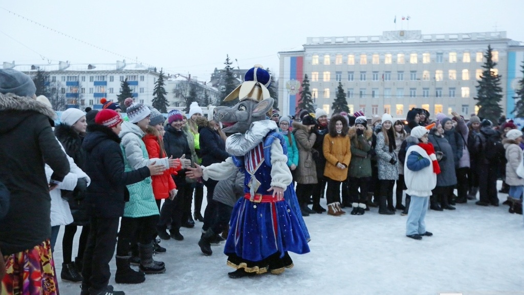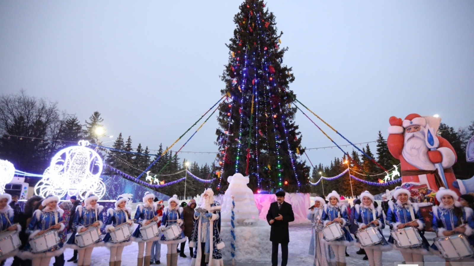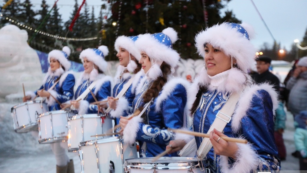 Новогодний антураж способствовал праздничному настроению — площадь украсили ледяные скульптуры и горки. Музыкальные коллективы и солисты дополнили праздник зажигательными песнями и танцами, а снежинки-барабанщицы — новогодним маршем.