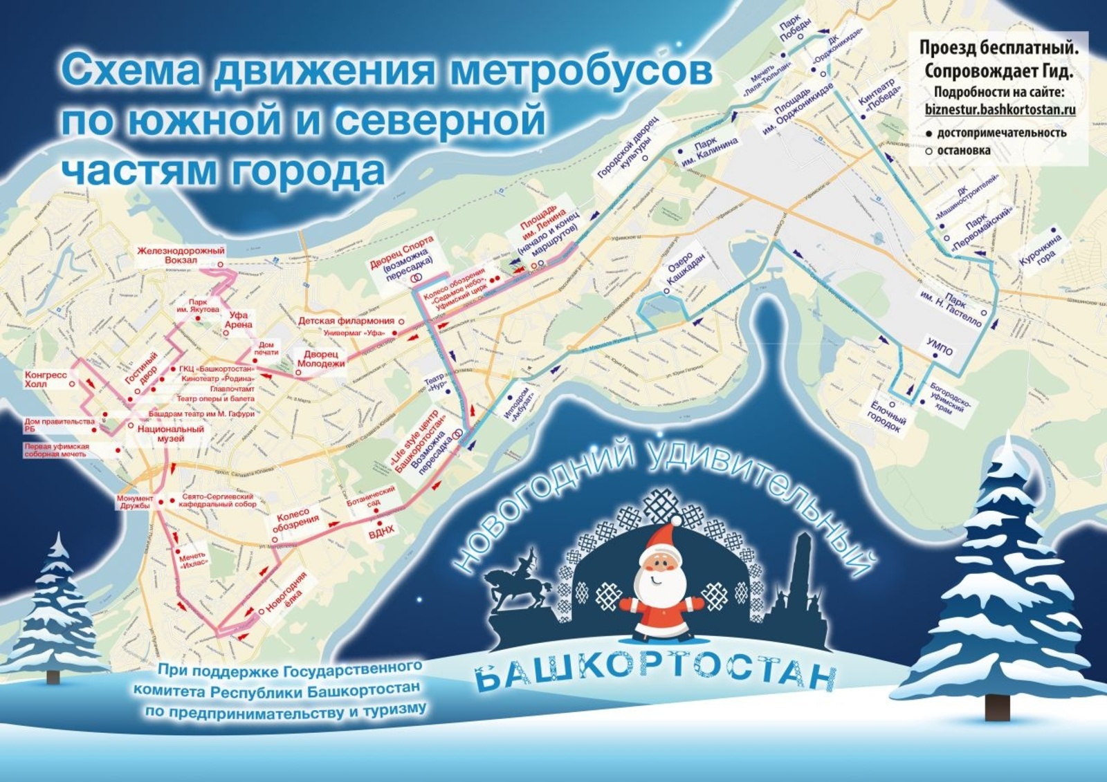 Как сообщает пресс-центр Госкомитета республики по предпринимательству и туризму, с 3 по 8 января по столице был также запущен автобус «Уфа экскурсионная», следовавший по южной части столицы. Дополнительно туроператорами региона организованы новогодние поездки по базовым экскурсионным маршрутам, участниками которых стали порядка 2000 человек. Среди востребованных маршрутов — горнолыжные курорты, базы отдыха, турбазы и санатории, а также конно-санные, снегоходные, лыжные и экскурсионные туры. В природных парках Башкортостана отдохнули свыше 700 туристов. Наибольшей популярностью пользовались парки «Иремель», «Аслы-куль» и «Мурадымовское ущелье».