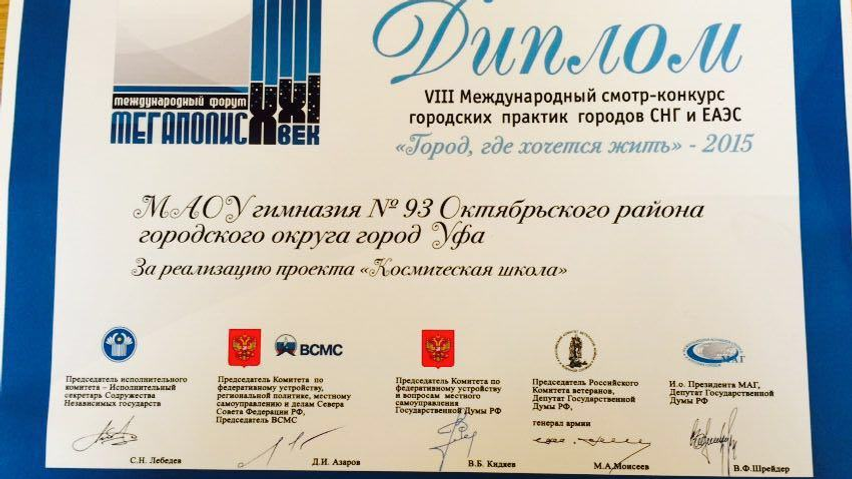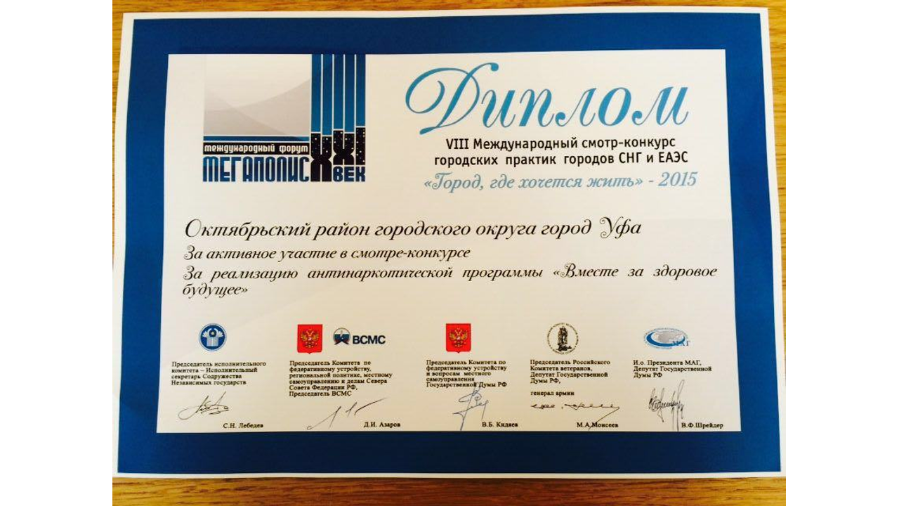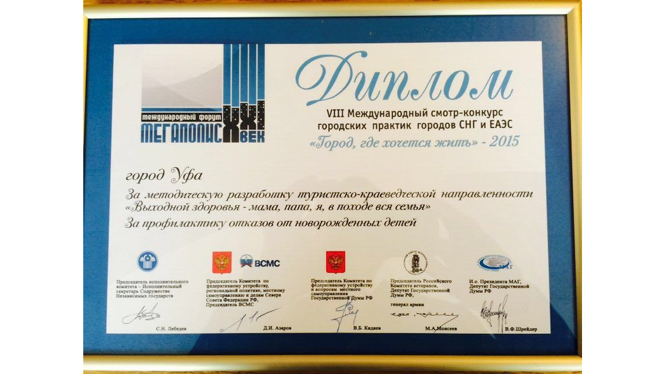 Международное жюри отметило столицу республики. Уфа получила Диплом за методическую разработку туристско-краеведческой направленности, за профилактику отказов от новорожденных детей, реализацию проекта «Космическая школа», антинаркотической программы «Вместе за здоровое будущее». Главу администрации города Ирека Ялалова наградили медалью за вклад в подготовку празднования 70-летия Победы в Великой Отечественной войне.