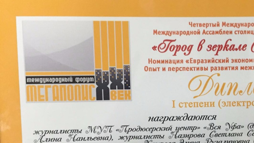 «Телеканал «Вся Уфа» получил дипломы первой степени. Среди награжденных на Международной ассамблее столиц и крупных городов наши журналисты Элина Хаирова и Светлана Назирова. В номинации «Евразийский экономический союз: год первый. Опыт и перспективы развития международного сотрудничества» жюри отметило работу журналистов «Визит в Поднебесную: Уфа - Цицикар - Шэньян», а в номинации «Эффективное управление городом - повышение качества жизни населения» — программу «Уфимский городовой», — рассказал Булат Терегулов.