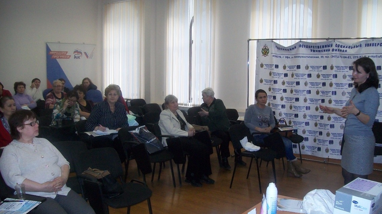 УФА, 25 фев 2016. /ИА «Башинформ», Гульфия Акулова/. 25 февраля в Уфе филиал Российского государственного социального университета совместно с городской Службой социальной помощи «Ваша сиделка» организовали экспресс-обучение «Школа правильного ухода». Курс лекций посетили более 30 слушателей, среди них как практикующие сиделки, люди, имеющие опыт ухода за больными и пожилыми людьми, так и граждане, желающие взяться за эту сложную и специфическую работу. Соискателей ознакомили с правилами работы сиделок, особенностями выстраивания отношений с подопечными, основными правилами гигиены подопечных, профилактикой болезней, связанных с длительным постельным режимом больных, современными инновационными методами ухода за тяжелобольными, особенностями ухода за больными, перенесшими инсульты, травмы, пациентами с болезнью Альцгеймера.