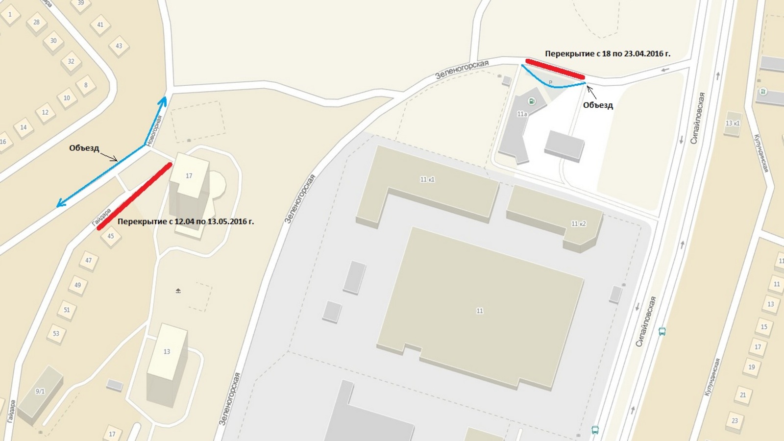 УФА, 11 апр 2016. /ИА «Башинформ», Ксения Калинина/. В Уфе ведется строительство ливневой канализации на улице Новогорной — на участке от ул. Российской до ул. Сипайловской. В связи с работами с 12 апреля по 13 мая текущего года планируется закрыть проезжую часть по улице Гайдара — от ул. Зеленогорской,17 до ул. Гайдара, 45. Водителям автотранспорта предлагается ездить через улицу Новогорную. С 18 по 23 апреля 2016 года закроют участок по улице Зеленогорской, в районе автозаправки «Башнефть». Объехать данный отрезок можно будет через наземную парковку у АЗС.
