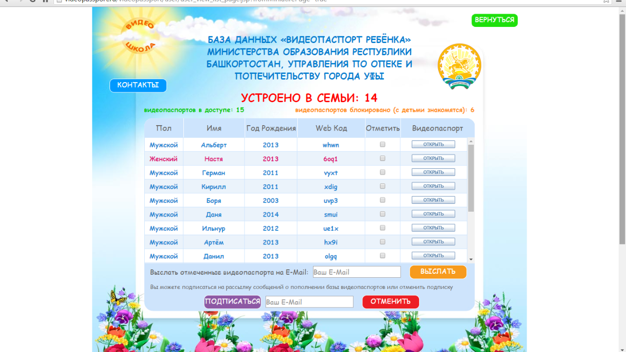 Мультимедийная информационно-поисковая система для усыновителей «Видеопаспорт» собирает базу данных детей, оставшихся без попечения родителей и находящихся в детских учреждениях по всей России. Система включает создание видеопаспортов для размещения на сайте