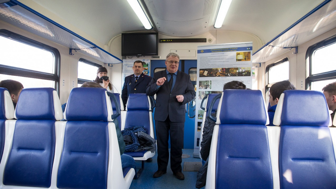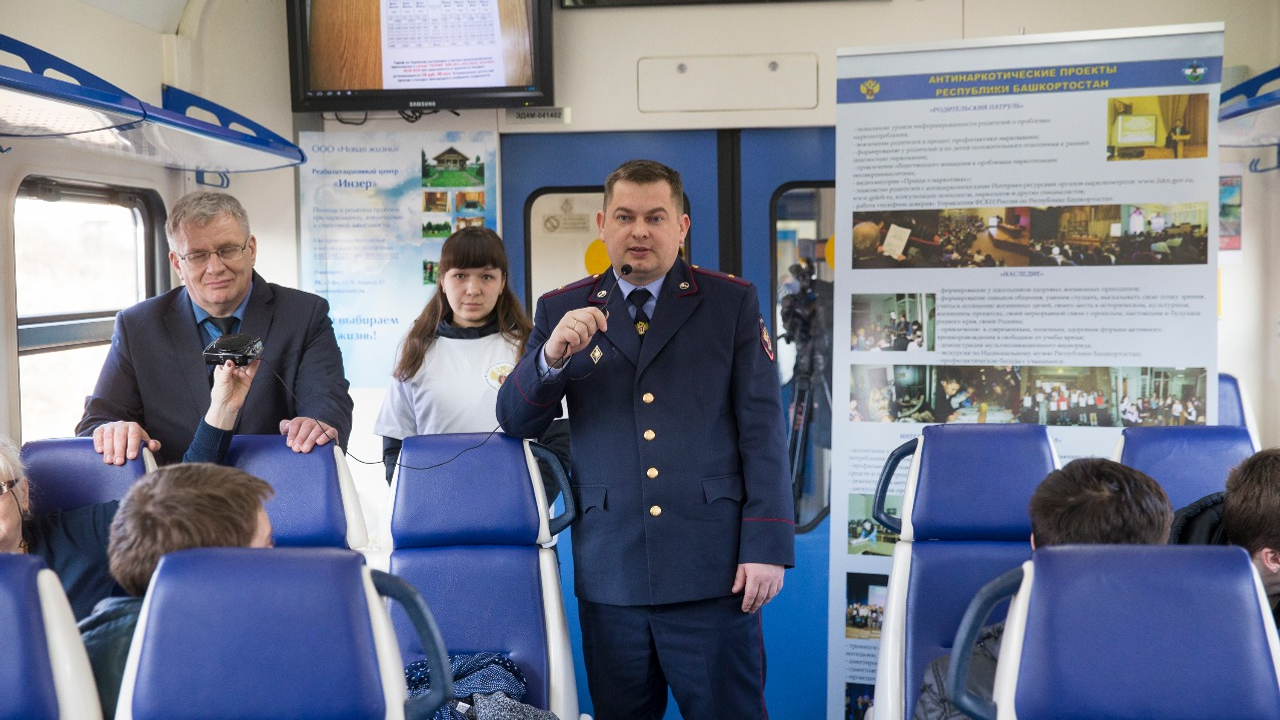 УФА, 12 апр 2016. /ИА «Башинформ», Сергей Захаров/. В рамках профилактической акции «Экскурсионная электричка» сотрудники Управления ФСКН по Башкортостану прочитали юным пассажирам лекцию о вреде наркотиков. Встреча наркополицейских с молодыми людьми состоялась во время следования электропоезда «Муса Гареев» по маршруту Уфа - Шакша - Уфа.
