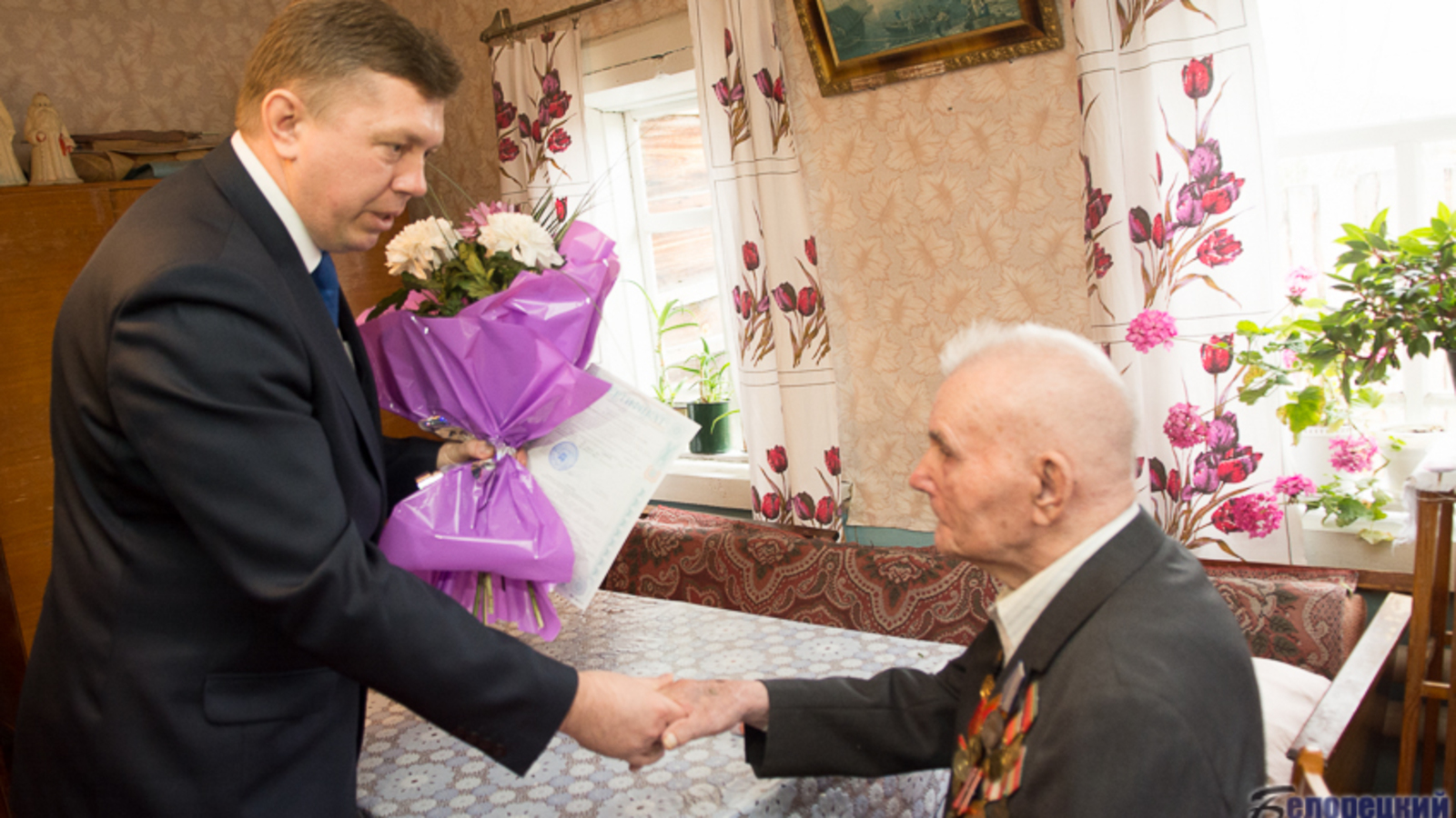 УФА, 20 апр 2016. /ИА «Башинформ», Ксения Калинина/. В Белорецком районе инвалиду Великой Отечественной войны Леониду Копытову глава администрации Владислав Миронов вручил сертификат о предоставлении единовременной денежной выплаты на строительство или приобретение жилья.