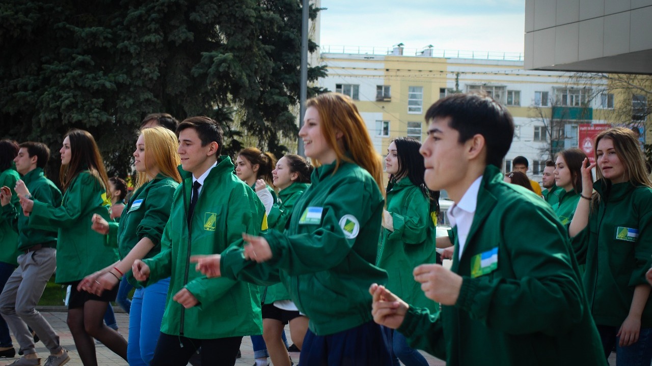 В минувшие выходные активная студенческая молодежь организовала масштабный танцевальный флешмоб возле Дворца Молодежи (ул. 50 лет Октября, 21). Все участники праздника были в зеленой форме, после красочного танца студенты вместе построили огромный круг в виде земного шара.